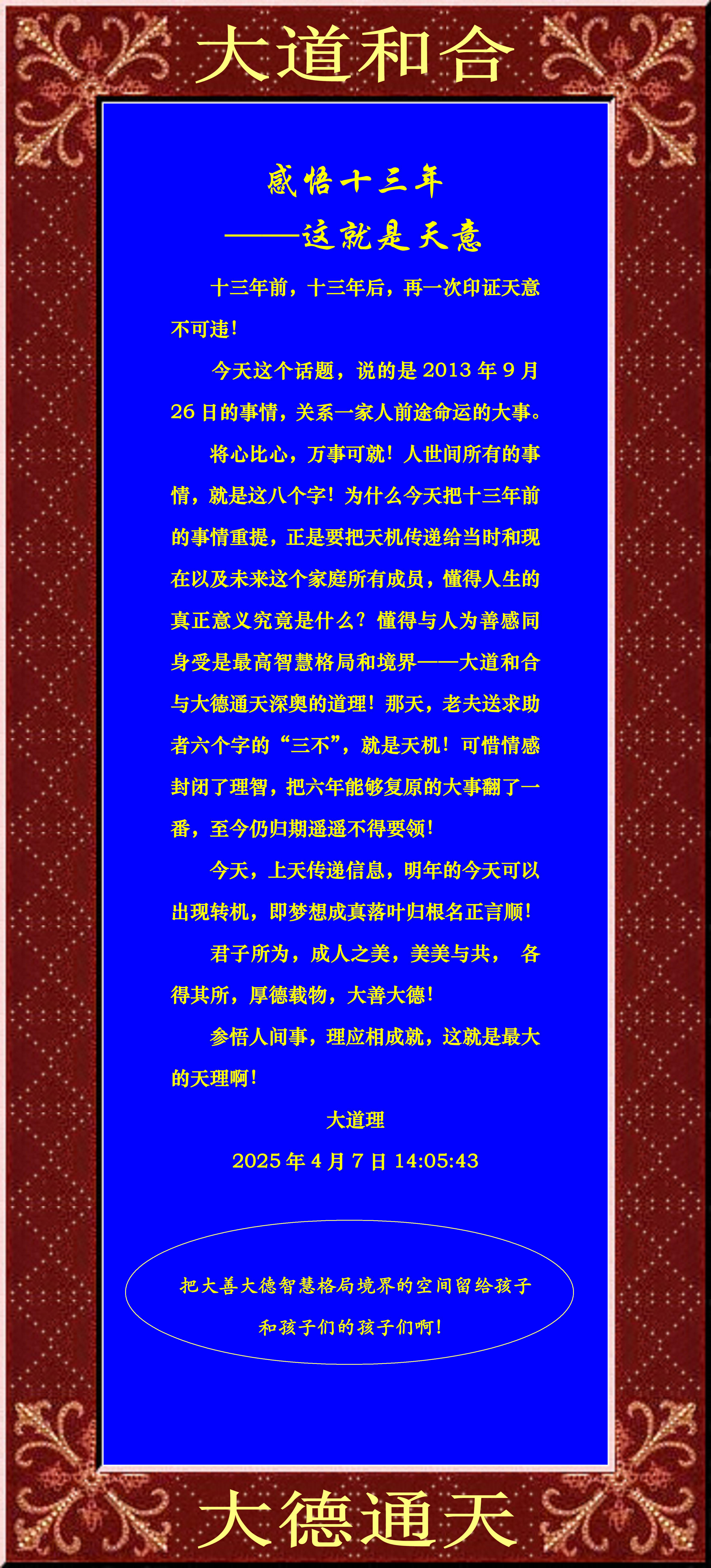 将心比心,万事可就!人世间所有的事情,就是这八个字!为什么今天把十三年前的事情重提,正是要把天机传递给当时和现在以及未来这个家庭所有成员,懂得人生的真正意义究竟是什么?懂得与人为善感同身受是最高智慧格局和境界——大道和合与大德通天深奥的道理!那天,老夫送求助者六个字的“三不”,就是天机!可惜情感封闭了理智,把六年能够复原的大事翻了一番,至今仍归期遥遥不得要领!