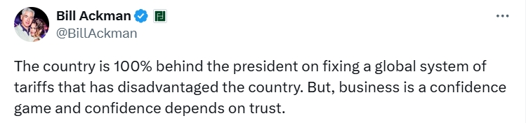 “最尖锐”的批评言论来自,在2024年美国总统大选中“倒戈”支持特朗普的美国亿万富翁、知名对冲基金经理比尔·阿克曼(Bill Ackman)。他在周日发长文警告称,继续征收新关税无异于发动一场“经济核战争”。