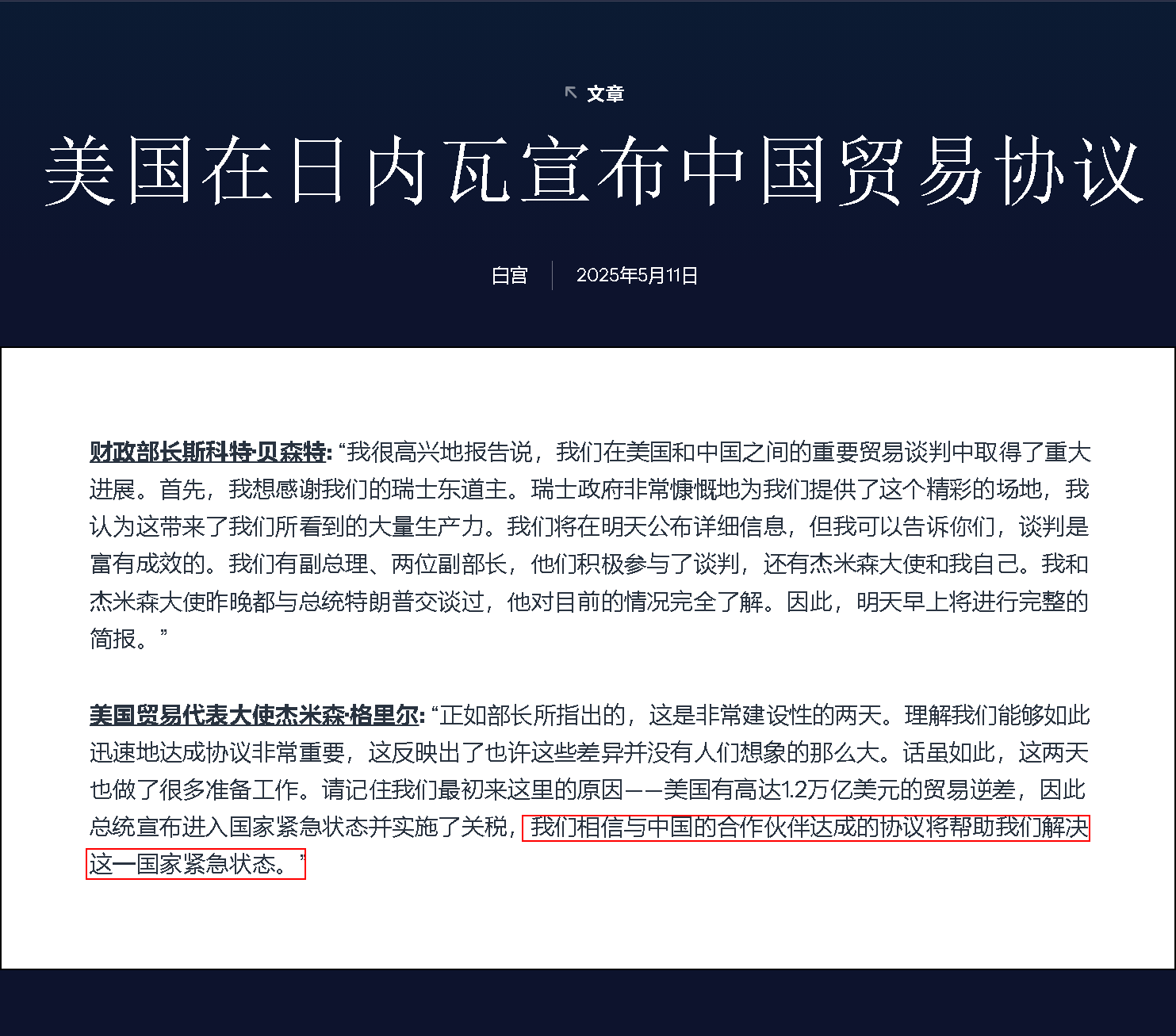 新华社日内瓦5月11日电(记者石松 焦倩)中美经贸高层会谈5月10日至11日在瑞士日内瓦举行。中美经贸中方牵头人、国务院副总理何立峰当地时间11日晚在出席中方代表团举行的新闻发布会时表示,此次中美经贸高层会谈坦诚、深入、具有建设性,达成重要共识,并取得实质性进展。双方一致同意建立中美经贸磋商机制。中美双方将尽快敲定相关细节,并将于5月12日发布会谈达成的联合声明。