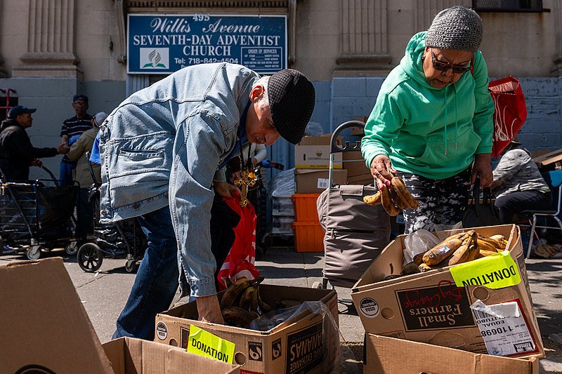 当地时间2025年4月23日,美国纽约,民众在布朗克斯一座教堂外领取食物。 视觉中国