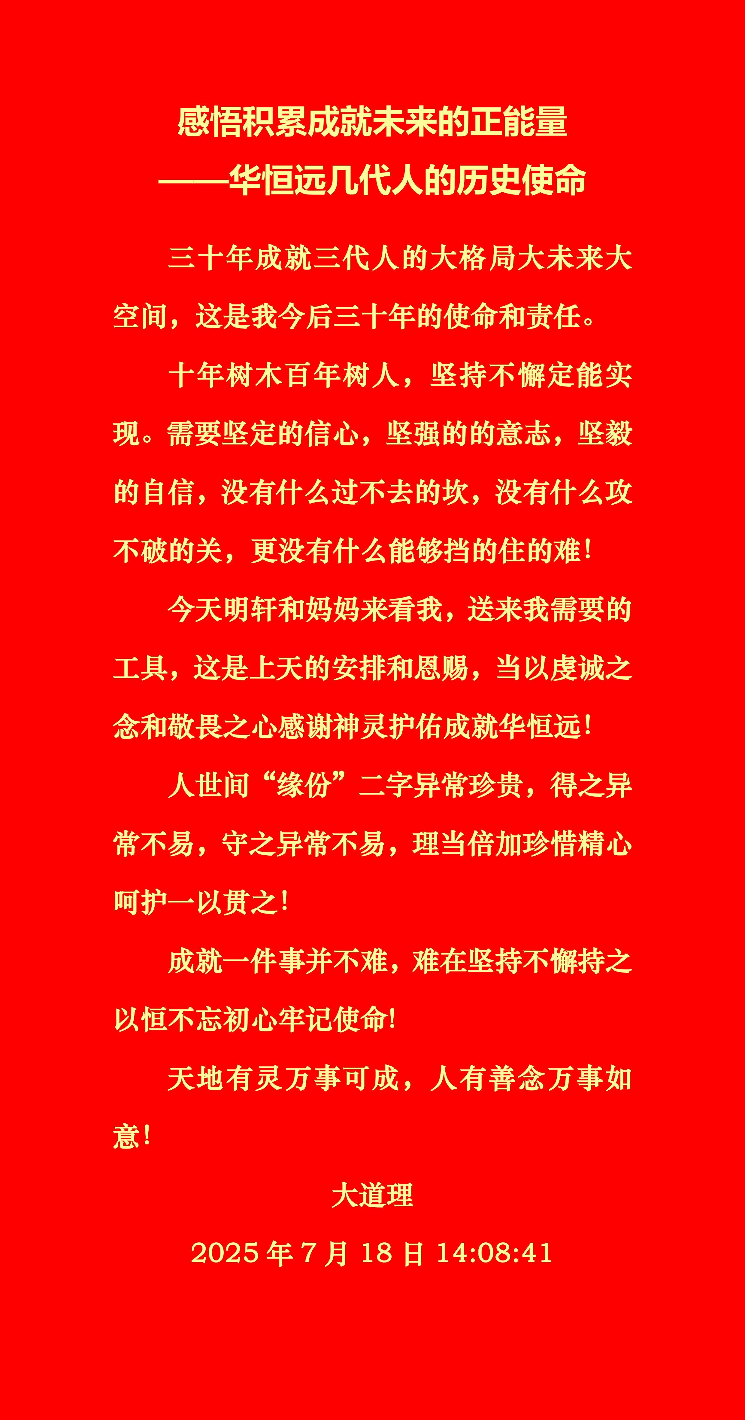 三十年成就三代人的大格局大未来大空间,这是我今后三十年的使命和责任。