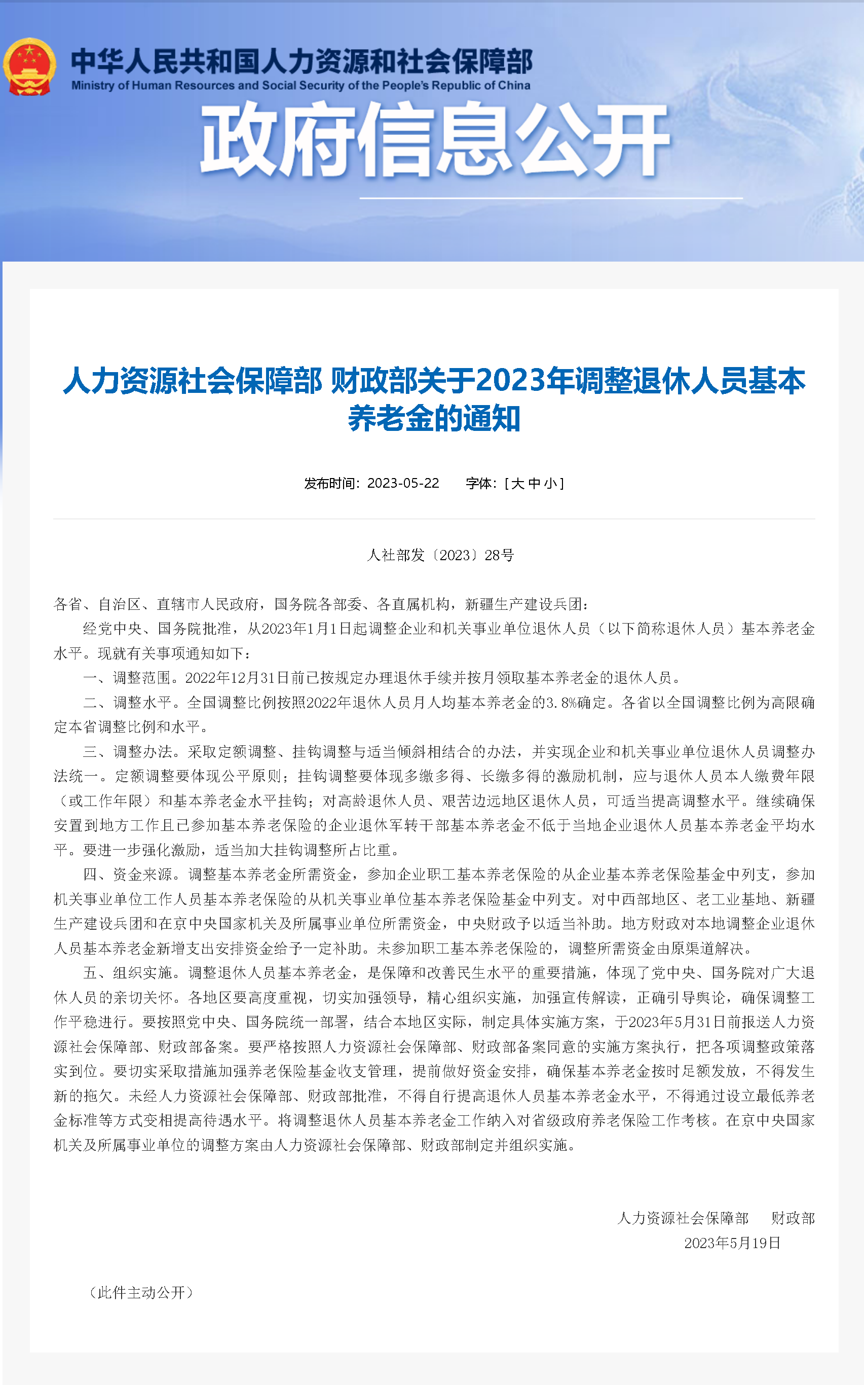 今天,人社部、财政部公布了今年继续调整退休人员基本养老金的通知。这是继2005年以来全国连续第19年增加退休人员基本养老金,从2004年人均714元到今年3315元,全国养老金平均增加了2601元,提高了3.64倍。