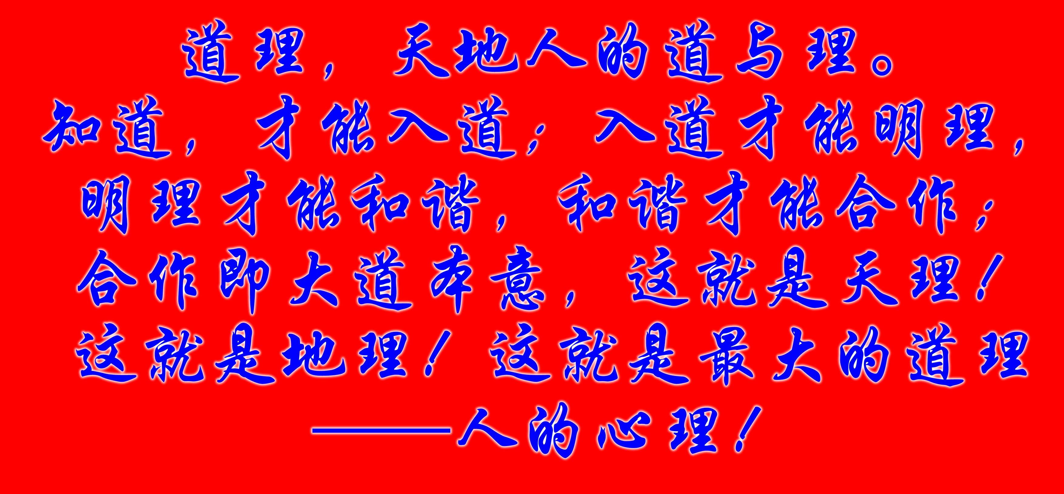 道理,天地人的道与理。知道,才能入道;入道才能明理,明理才能和谐,和谐才能合作;合作即大道本意,这就是天理!这就是地理!这就是最大的道理——人的心理!