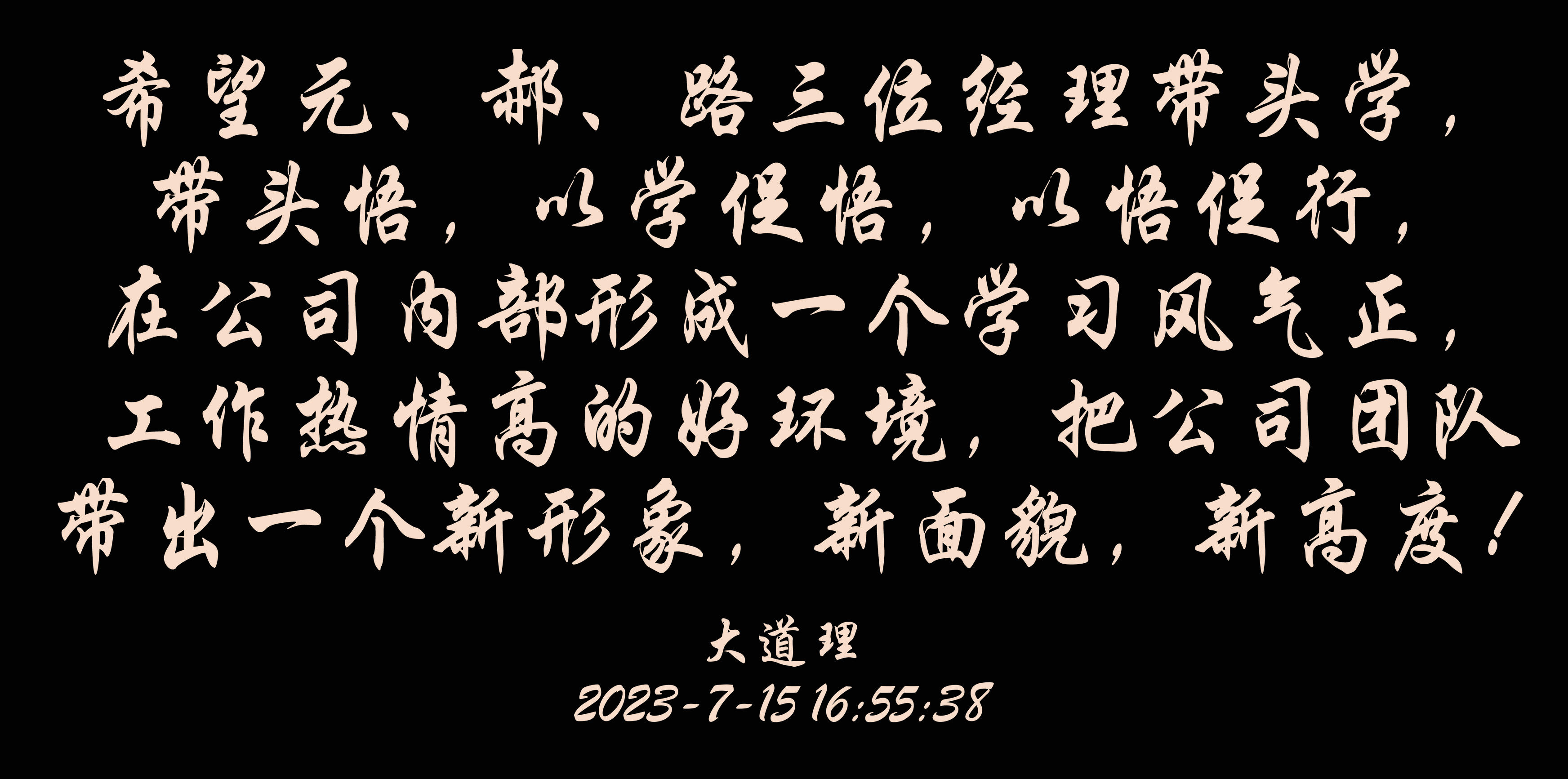 认真学习总书记讲话精神,深刻领会讲话核心内涵和要义,提高理解能力和执行能力,把乐天堂fun88建设好是学习根本要求,希望元、郝、路三位经理带头学,带头悟,以学促悟,以悟促行,在公司内部形成一个学习风气正,工作热情高的好环境,把公司团队带出一个新形象,新面貌,新高度!