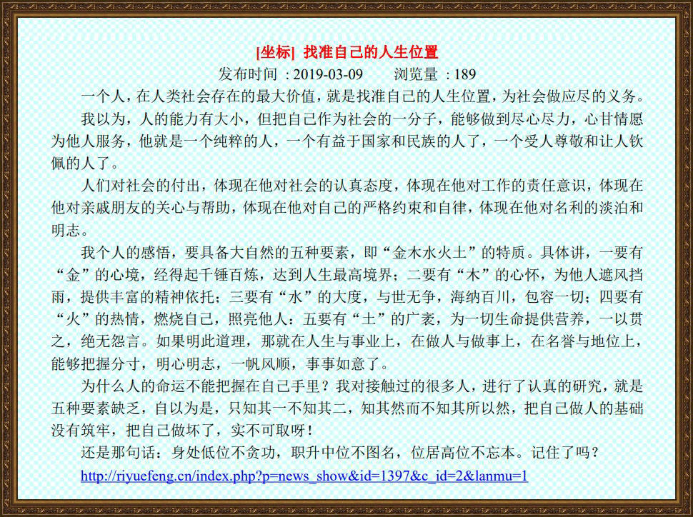 大事情如此,小事情更是如此!这是经过近七十年的实践证明了的,一件事情要办的顺利,办的成功,必须把握机会,时机不到,你就是再努力,你也是白费功夫;时机一到,顺时顺势,四两拨千斤,不费吹灰之力!这确实是一门大学问,一门科学无法解释而确实存在的事物或者叫现象,我给这种高深莫测的现象定义为灵感,就是灵性自然现象。这种现象,不是能够通过学习或者实践能够得到的,也不是通过想象和发挥可以掌握的,只是一瞬间的感应,就能得到前因后果全过程的反馈。