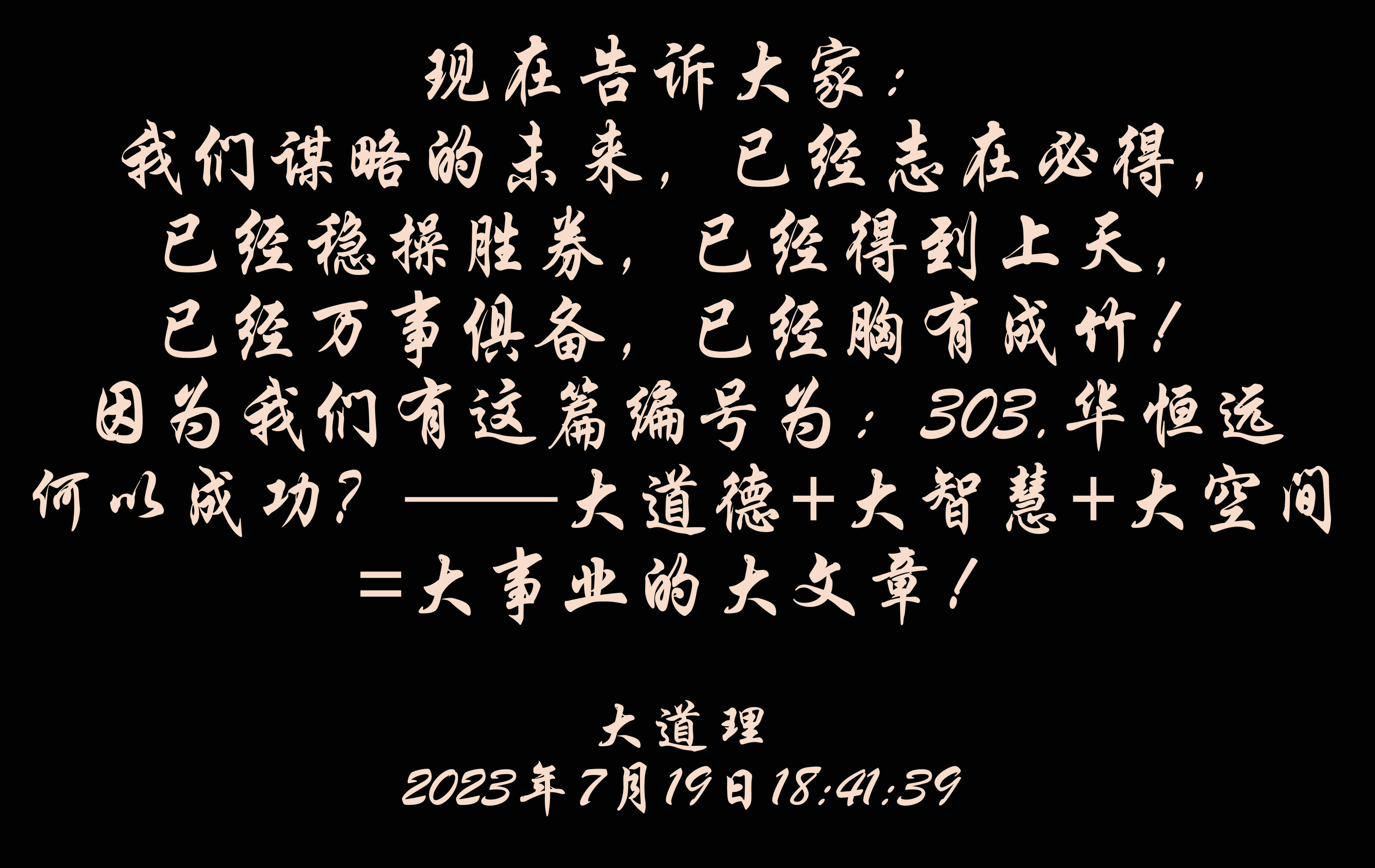 现在告诉大家:我们谋略的未来,已经志在必得,已经稳操胜券,已经得到上天,已经万事俱备,已经胸有成竹!因为我们有这篇编号为:303.乐天堂fun88何以成功?——大道德+大智慧+大空间=大事业的大文章!