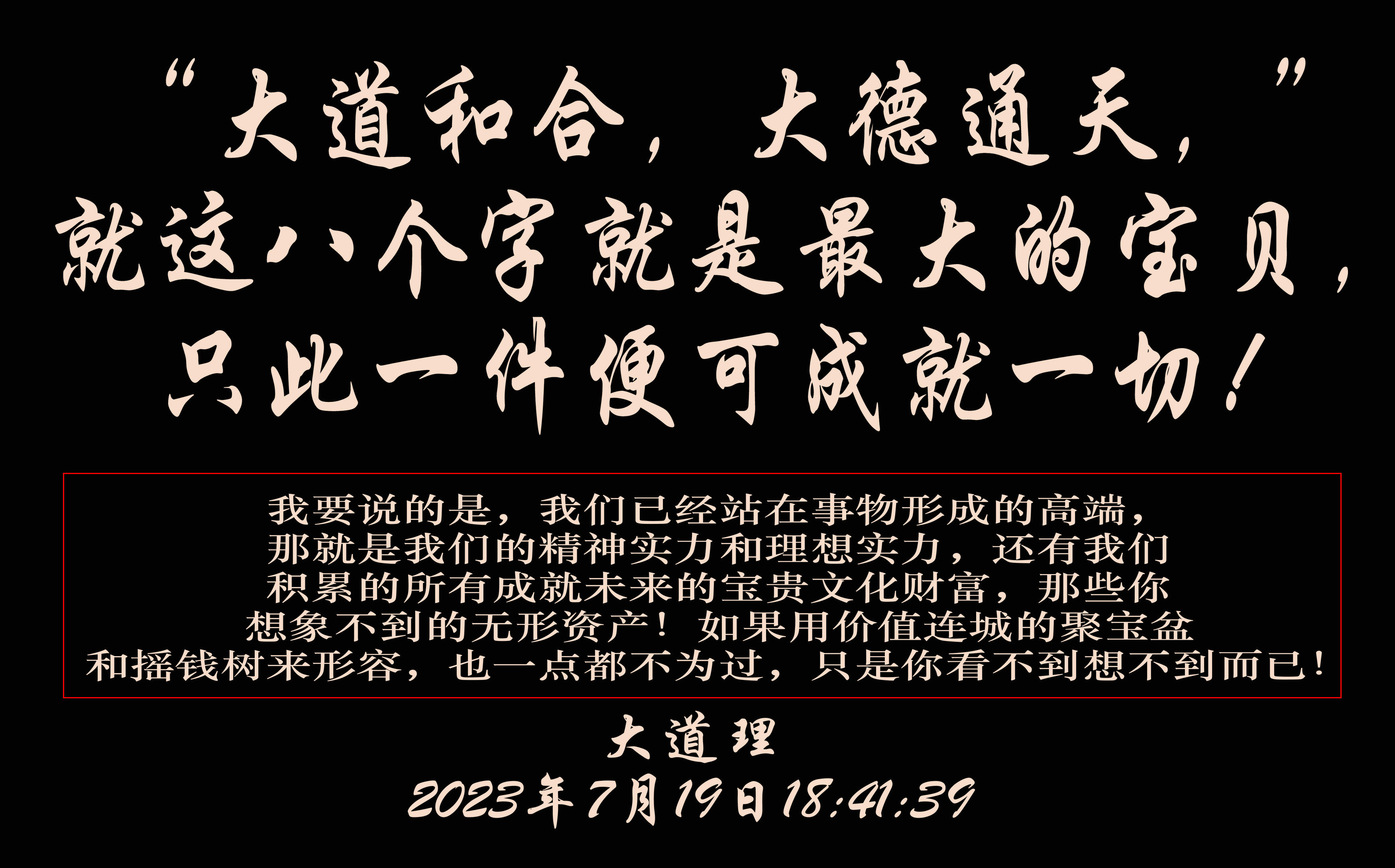 “大道和合,大德通天,”就这八个字就是最大的宝贝,只此一件便可成就一切!更不要说我们压箱底的宝贝还多的很呢!我这个人不存货,该给谁那就给谁,一点也不吝啬,给他们比我保存着更有价值!