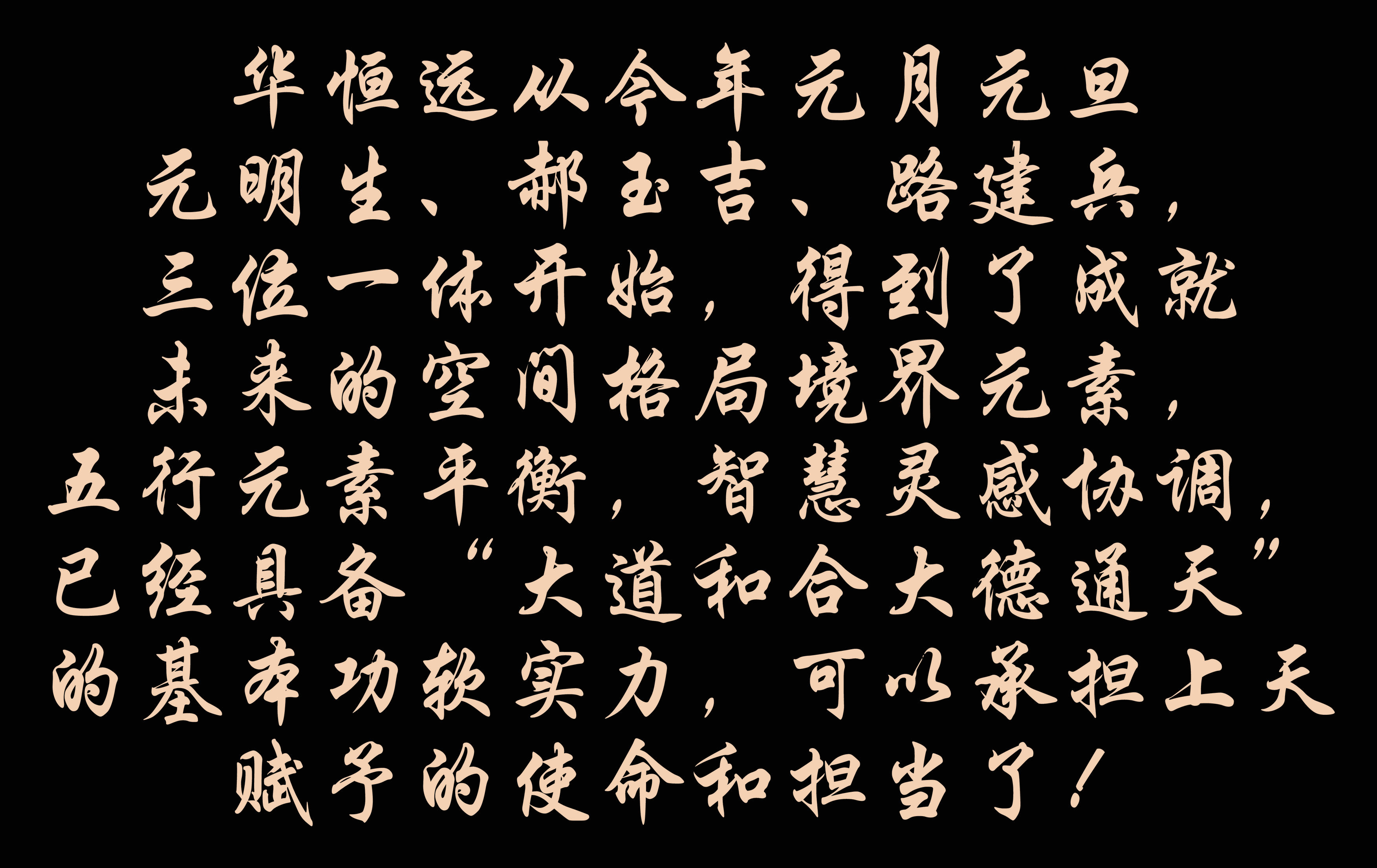 乐天堂fun88从今年元月元旦元明生、郝玉吉、路建兵,三位一体开始,得到了成就未来的空间格局境界元素,五行元素平衡,智慧灵感协调,已经具备“大道和合大德通天”的基本功软实力,可以承担上天赋予的使命和担当了!