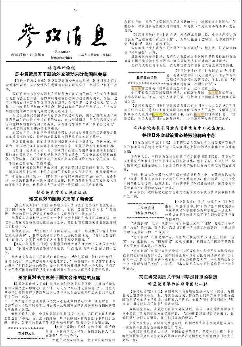 对于即将举行包括共产党中国问题的讨论在内的日美会谈的岸信介内阁说来,它对社会党使节团同毛主席的会见,表示相当关心,这是不言而喻的。岸信介内阁和自由民主党的对共产党中国方针是把接触尽可能限制在经济和文化范围内,而不走进政治领域。但是根据过去政府的态度来看,要说政府对经济和文化接触抱过热情,就是在情义上也说不出口来。的确,在政治上是有多方面的困难的,但是在正视国际形势的时候,如果始终采取目前这样的消极态度,只会使国民的希望落空。至少在文化、经济交流等方面,即使更进一步拿出热情来,照理美国也不会在表面上露出不满。不可否认,日中关系为日美关系所左右,是个事实,不过政府有无积极的热情,在相当程度上是能够使这个关系更富于灵活性的。