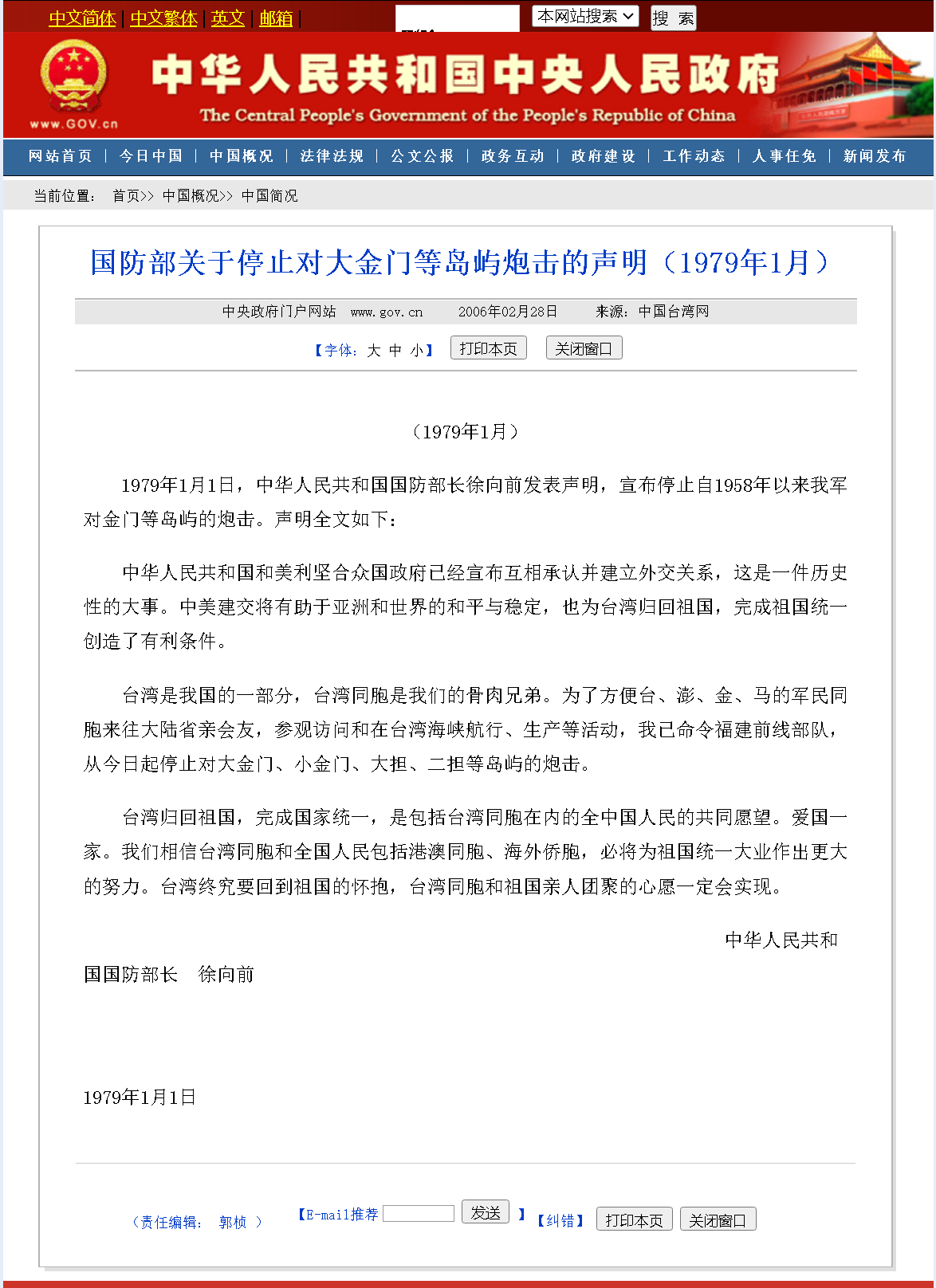 1979年元旦,中国同美国正式建立外交关系。同日,全国人大常委会发表《告台湾同胞书》,正式提出实现和平统一的大政方针;时任国防部长徐向前发表声明,宣布停止自1958年以来解放军对金门等岛屿的炮击。