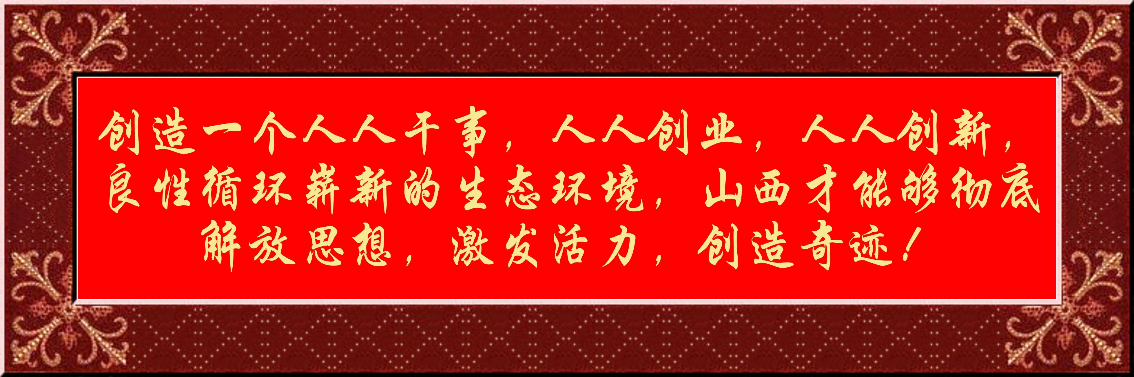 山西需要发展,需要大发展,需要以更大的胆识和魄力面对自身的差距和不足,那就是敢于革自己的命,把那些不适应新时代发展的条条框框彻底打破,把那些只为名而不为民的庸官彻底清除,创造一个人人干事,人人创业,人人创新,良性循环崭新的生态环境,山西才能够彻底解放思想,激发活力,创造奇迹!