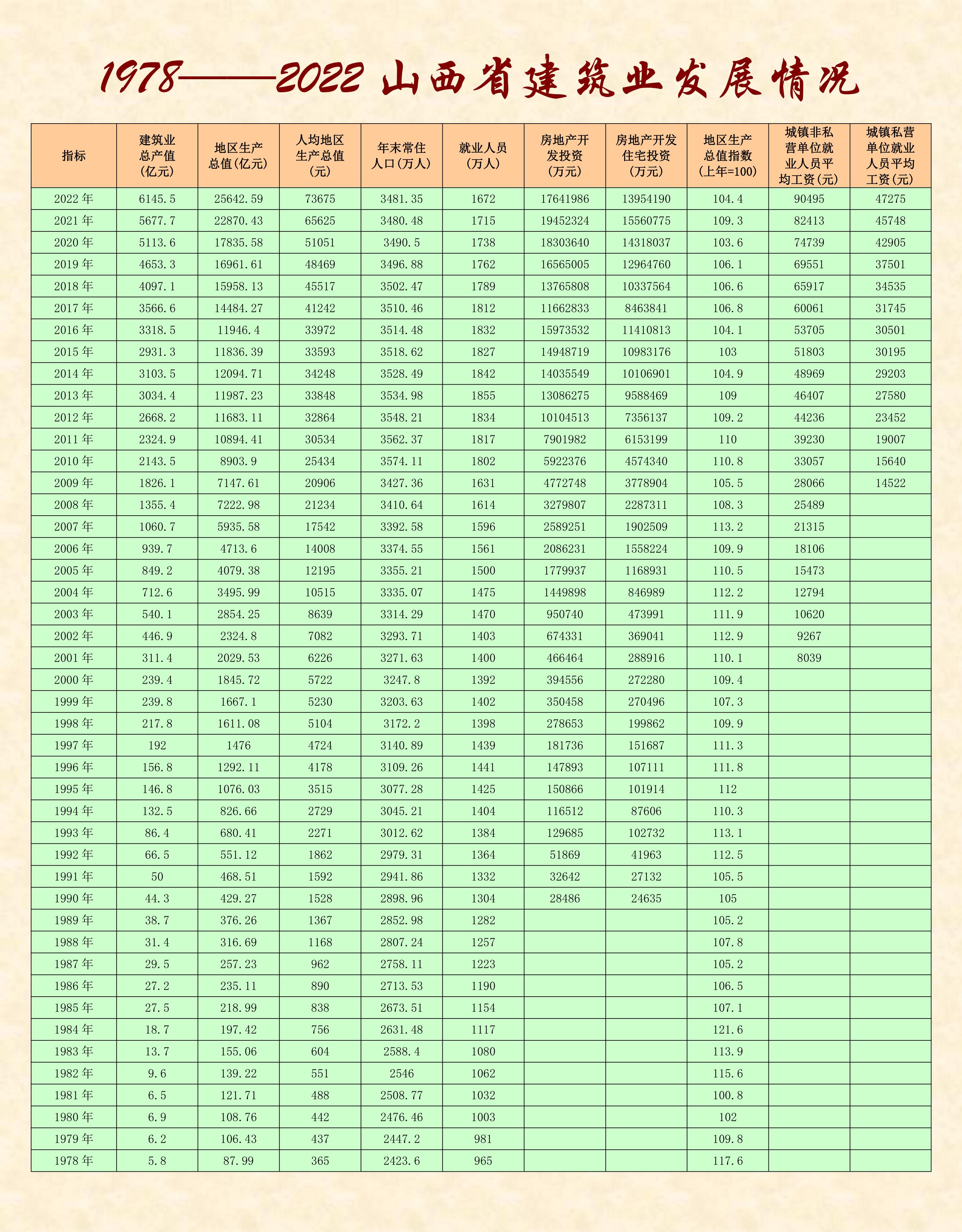 改革开放四十六年来,山西建筑业总产值增长111多倍,应该说发展速度超越了历史空间,这是从自己家内部看自己。