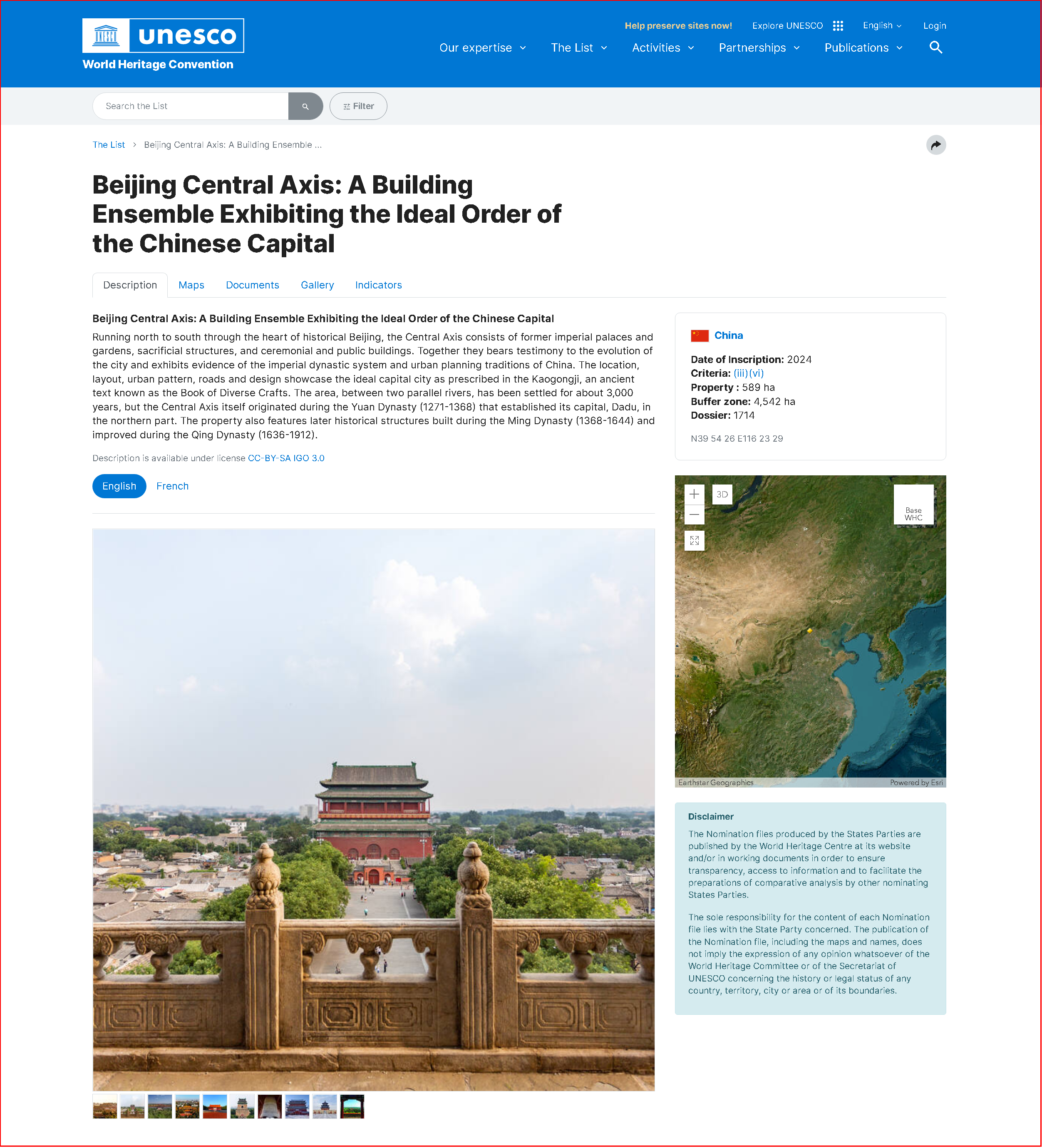 据介绍,联合国教科文组织世界遗产委员会认可“北京中轴线”的完整性、真实性和保护管理状况,及其作为社会和政治中心对中国社会发挥持续的作用,认为“北京中轴线”代表了世界城市历史中的一种特有类型,其所体现的中国传统都城规划理论和“中”“和”哲学思想,为世界城市规划史作出了重要贡献。该组织高度赞赏中国政府在北京老城文化遗产保护传承方面付出的巨大努力和取得的突出成绩。