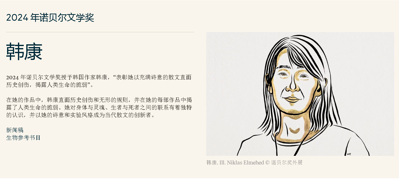 诺贝尔委员会主席安德斯·奥尔松说,韩江在作品中直面历史创伤,揭露人类生命的脆弱。她对肉体与灵魂、生与死之间的联系有着独特的认识,并以诗意和实验性风格成为当代散文的创新者。