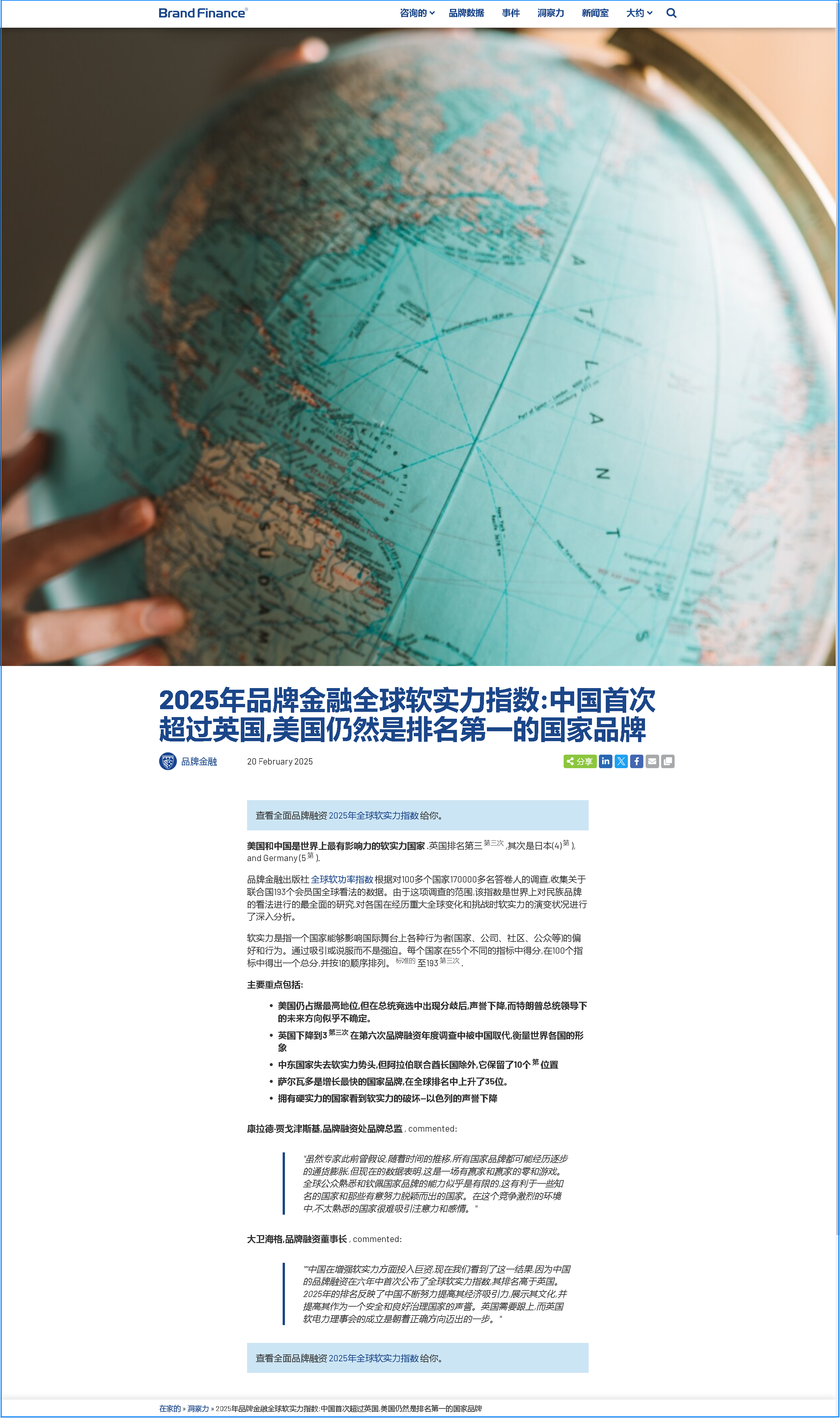 “品牌金融”咨询公司总裁大卫·海格说:“中国对软实力的投资正在显现成效,2025年中国软实力排名首次超过英国,反映出中国在不断加强经济吸引力、展示自身文化特色、加强安全及治理等方面的成果。”