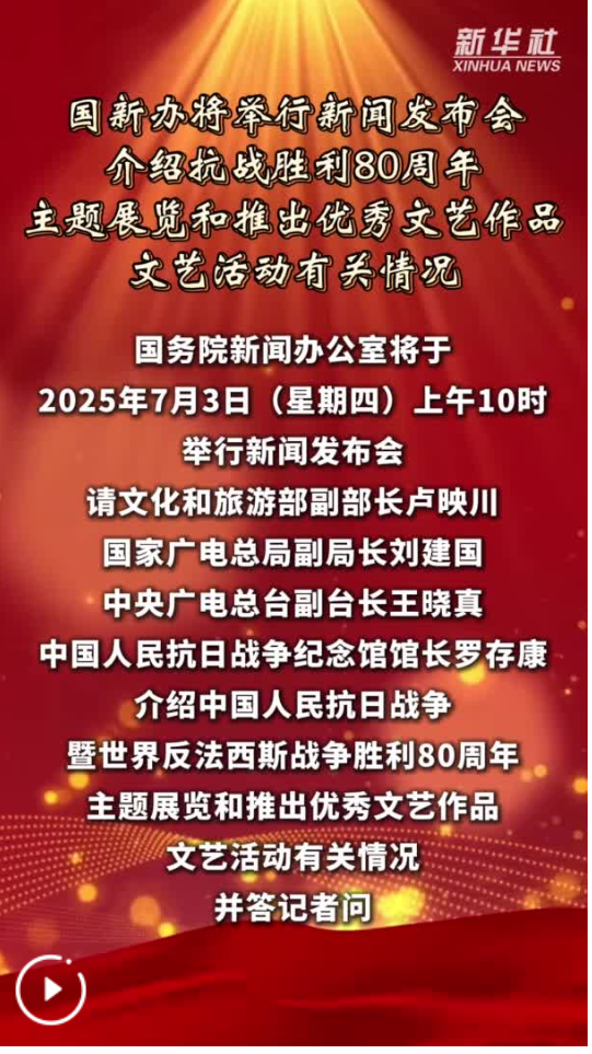 国务院新闻办公室将于2025年7月3日(星期四)上午10时举行新闻发布会,请文化和旅游部副部长卢映川、国家广电总局副局长刘建国、中央广电总台副台长王晓真、中国人民抗日战争纪念馆馆长罗存康介绍中国人民抗日战争暨世界反法西斯战争胜利80周年主题展览和推出优秀文艺作品、文艺活动有关情况,并答记者问。(记者 王子铭)