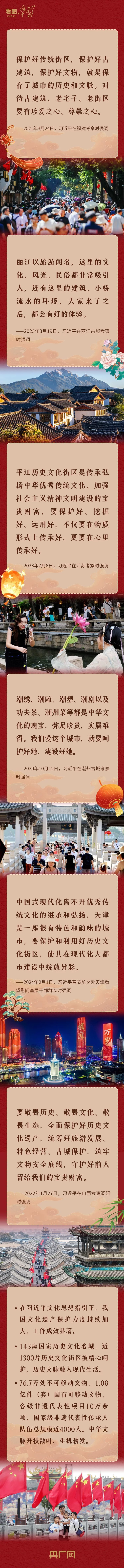 “对待古建筑、老宅子、老街区要有珍爱之心、尊崇之心。”党的十八大以来,习近平总书记在地方考察期间多次走访当地古城老街,察看历史文脉的保护与传承并作出重要指示。