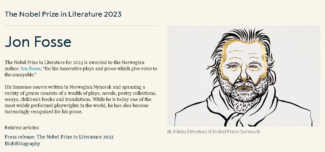 2023 年诺贝尔文学奖授予挪威作家乔恩·福斯,“表彰他的创新戏剧和散文,为难以言喻的事物发声。”他用挪威尼诺斯克语写成的巨著涵盖多种体裁,包括丰富的戏剧、小说、诗集、散文、儿童读物和翻译作品。虽然他如今是世界上演出最广泛的剧作家之一,但他的散文也越来越受到认可。