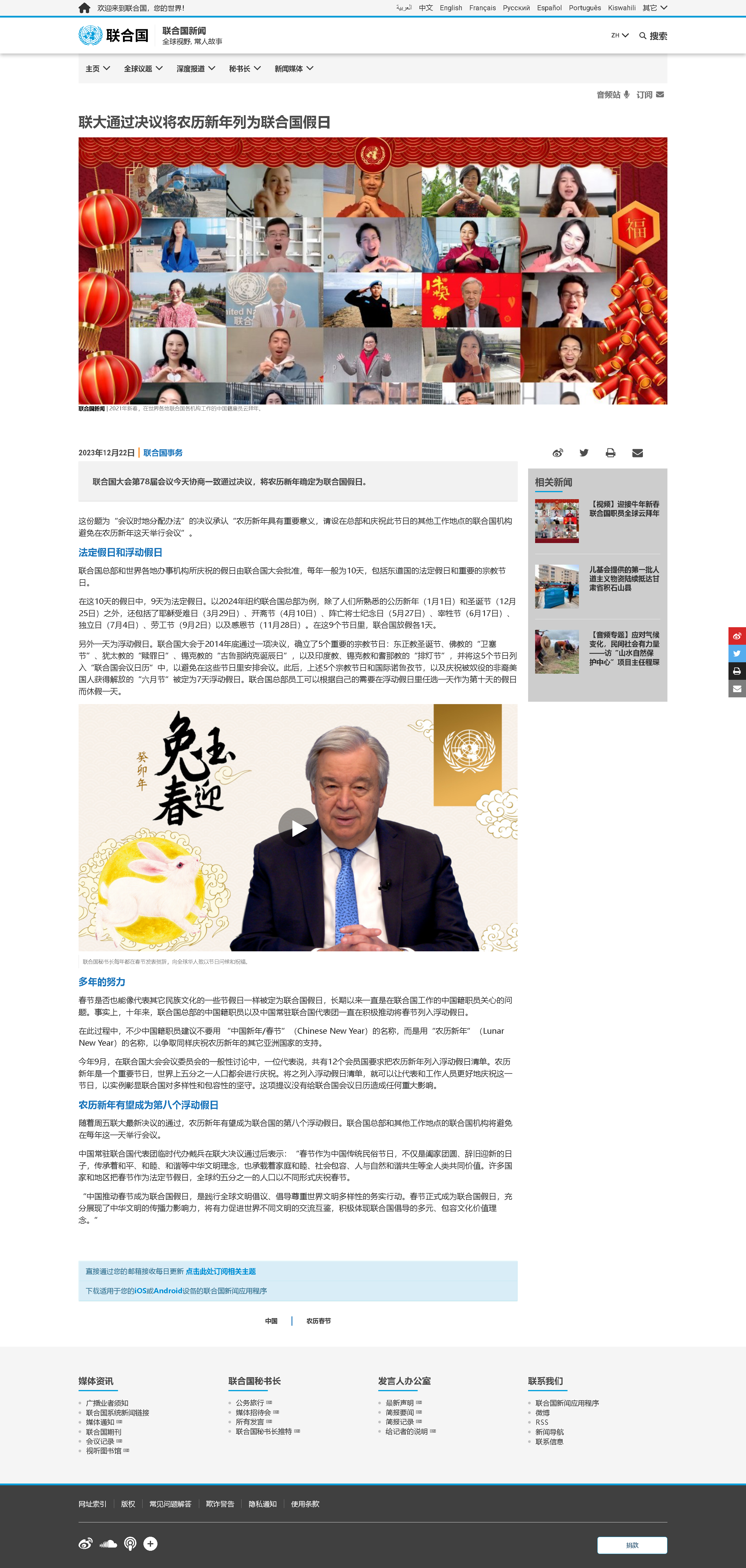 新华社北京12月23日电 题:当春节走向世界——从联合国过“年”说起