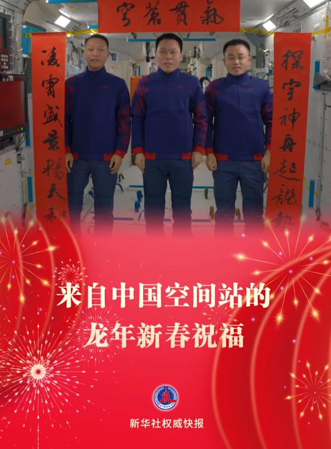视频中,指令长汤洪波说:“虽远离祖国、家人和亲人,但你们送来的年味儿我们都收到啦!我们在太空的这个年过得充实、幸福,请祖国和人民放心!”