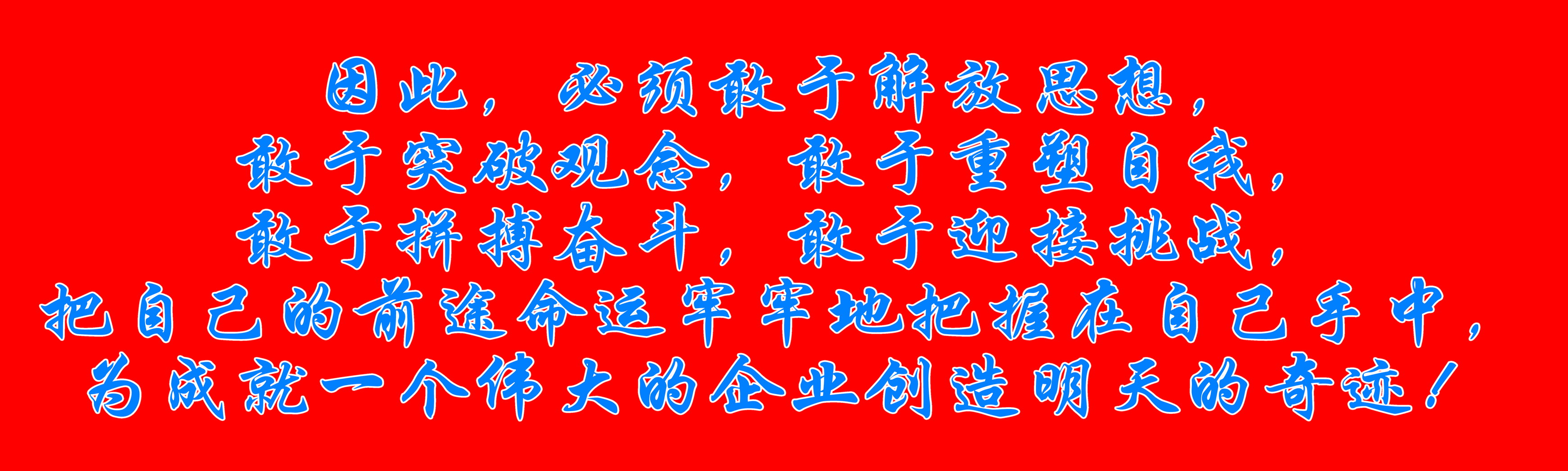 因此,必须敢于解放思想,敢于突破观念,敢于重塑自我,敢于拼搏奋斗,敢于迎接挑战,把自己的前途命运牢牢地把握在自己手中,为成就一个伟大的企业创造明天的奇迹!