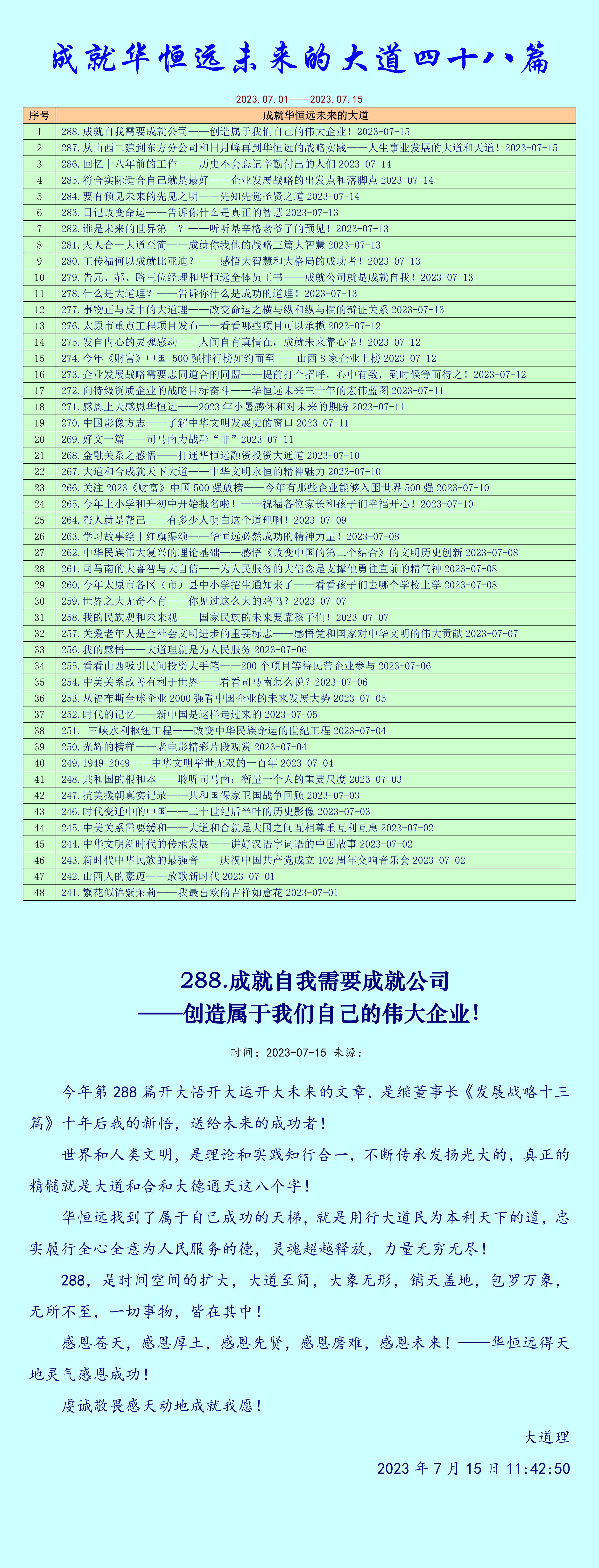 这是七月份前半个月288小时感悟感应灵感的总结,是上天的意愿。四十八篇发展战略系列文章,如果能够深刻思考,深刻感悟,深刻知行,必将形成强大的合力,成就你们所有的梦想!
