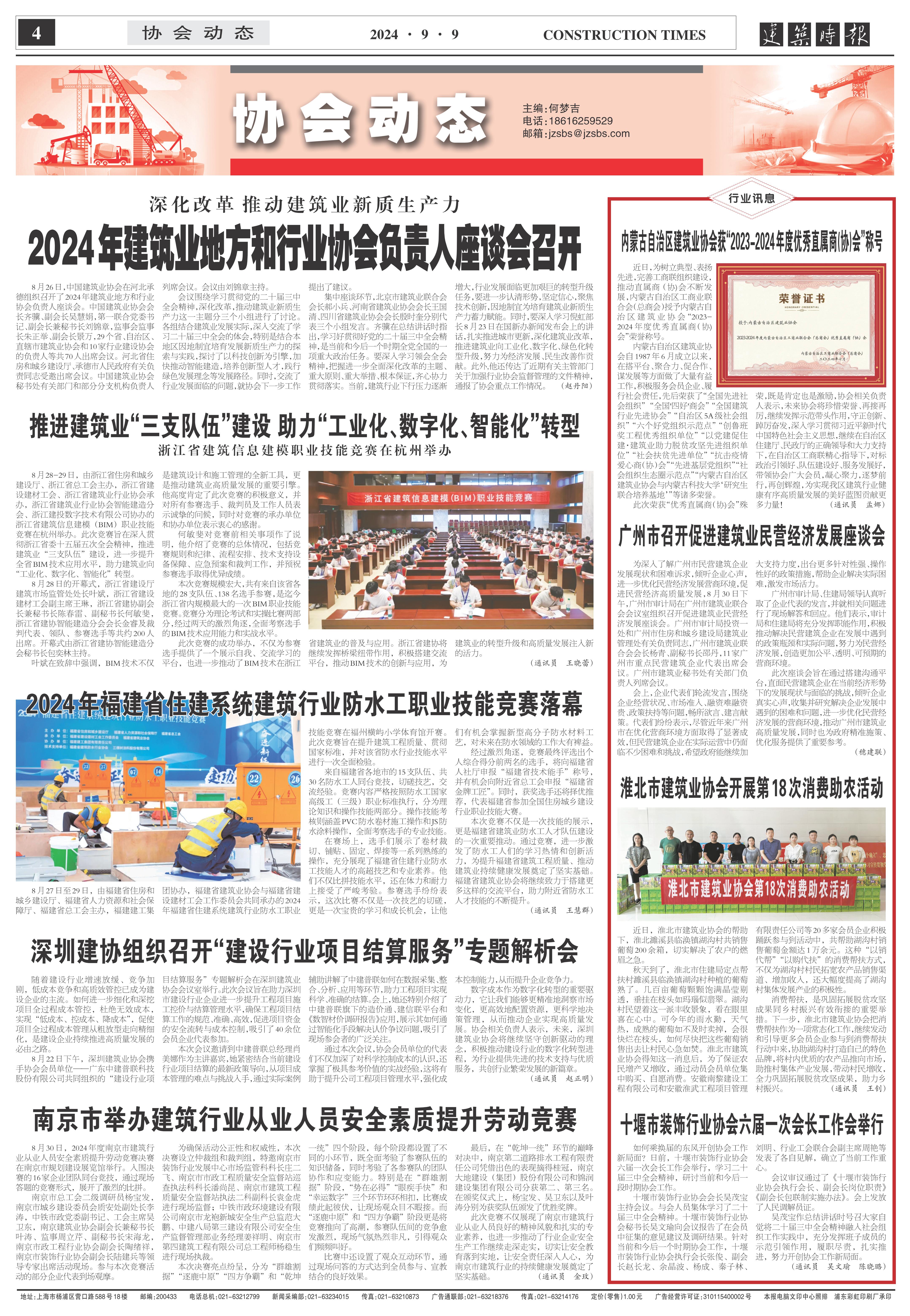 集中座谈环节,北京市建筑业联合会会长郝小兵、河南省建筑业协会会长王国清、四川省建筑业协会会长殷时奎分别代表三个小组发言。齐骥在总结讲话时指出,学习好贯彻好党的二十届三中全会精神,是当前和今后一个时期全党全国的一项重大政治任务。要深入学习领会全会精神,把握进一步全面深化改革的主题、重大原则、重大举措、根本保证,齐心协力贯彻落实。当前,建筑行业下行压力逐渐增大,行业发展面临更加艰巨的转型升级任务,要进一步认清形势,坚定信心,聚焦技术创新,因地制宜为培育建筑业新质生产力蓄力赋能。同时,要深入学习倪虹部长8月23日在国新办新闻发布会上的讲话,扎实推进城市更新,深化建筑业改革,推进建筑业向工业化、数字化、绿色化转型升级,努力为经济发展、民生改善作贡献。此外,他还传达了近期有关主管部门关于加强行业协会监督管理的文件精神,通报了协会重点工作情况。 (赵丹阳)