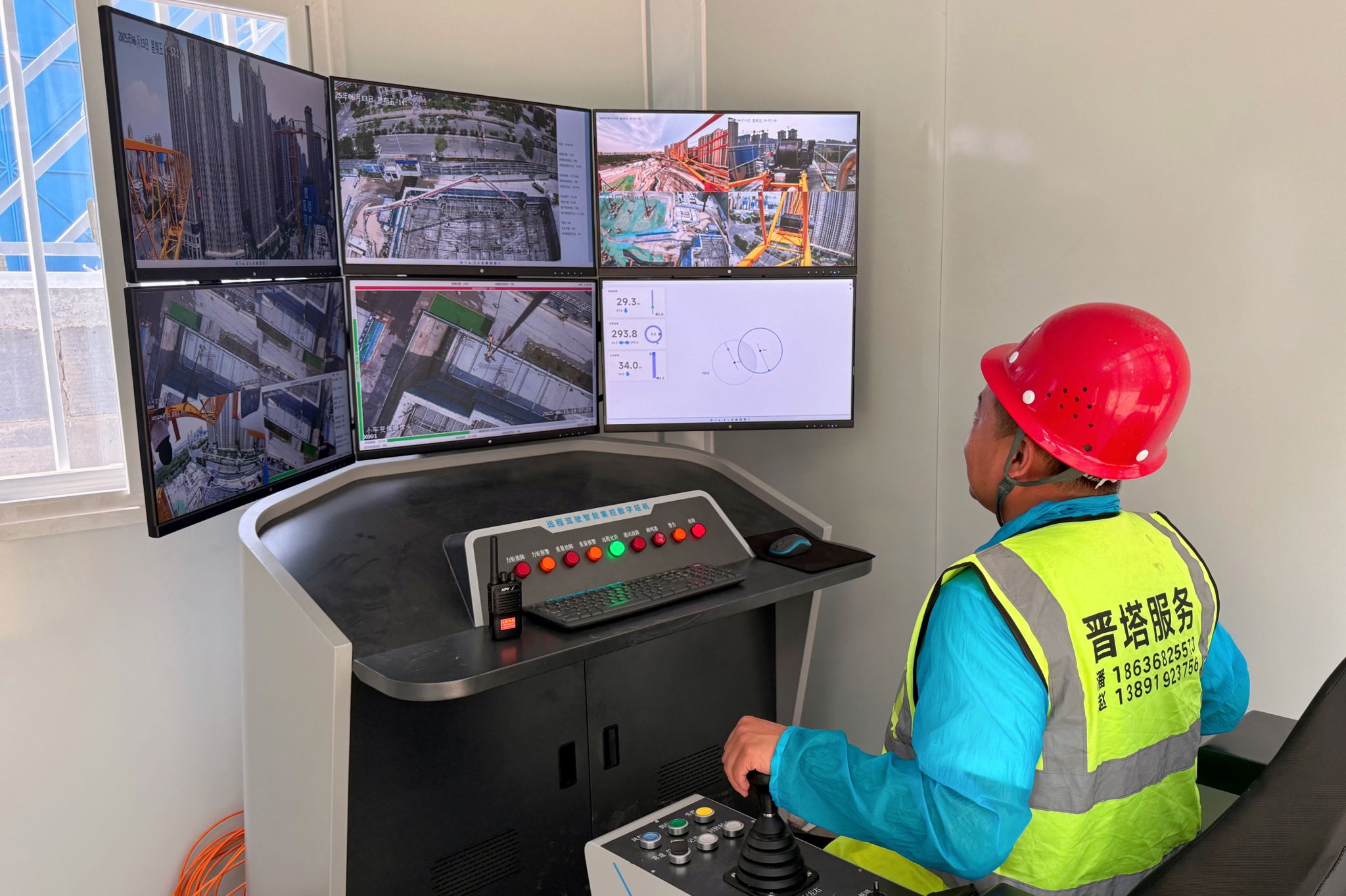 “双模式智能联动驾驶”技术实现了高空驾驶舱操作与地面远程操控的无缝切换。塔机司机既可在驾驶舱内开展传统高空作业,也可通过数字全景(5G)塔机集控驾驶舱,借助多块曲面巨幕实时传输的360°作业影像完成远程操作。这种灵活的操作切换,不仅改善了塔机司机的作业环境、优化了作业流程,更提升了操作的灵活性和响应速度,有效降低极端气候下的高空作业风险。