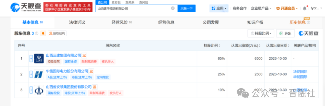 此外,上市央企华能国际出资2500万元,持有山西华建25%股权。