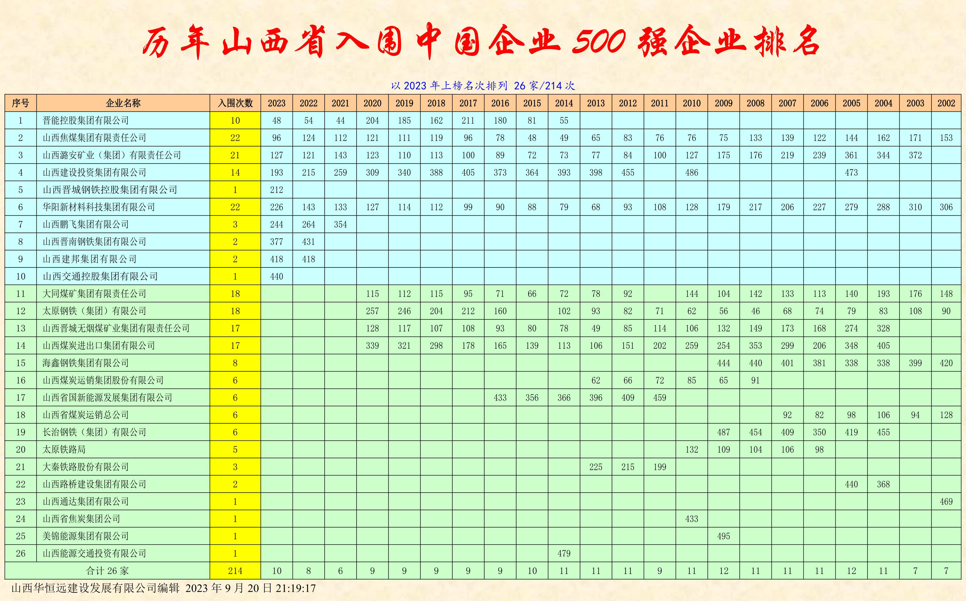 9月20日,中国企业联合会、中国企业家协会联合发布了2023中国企业500强榜单,榜单均以2022年企业营业收入为排序参考。2023中国企业500强入围门槛已经提升至469.98亿元亿元。今年山西省共有9家企业上榜,相较2022年的8家增加1家。