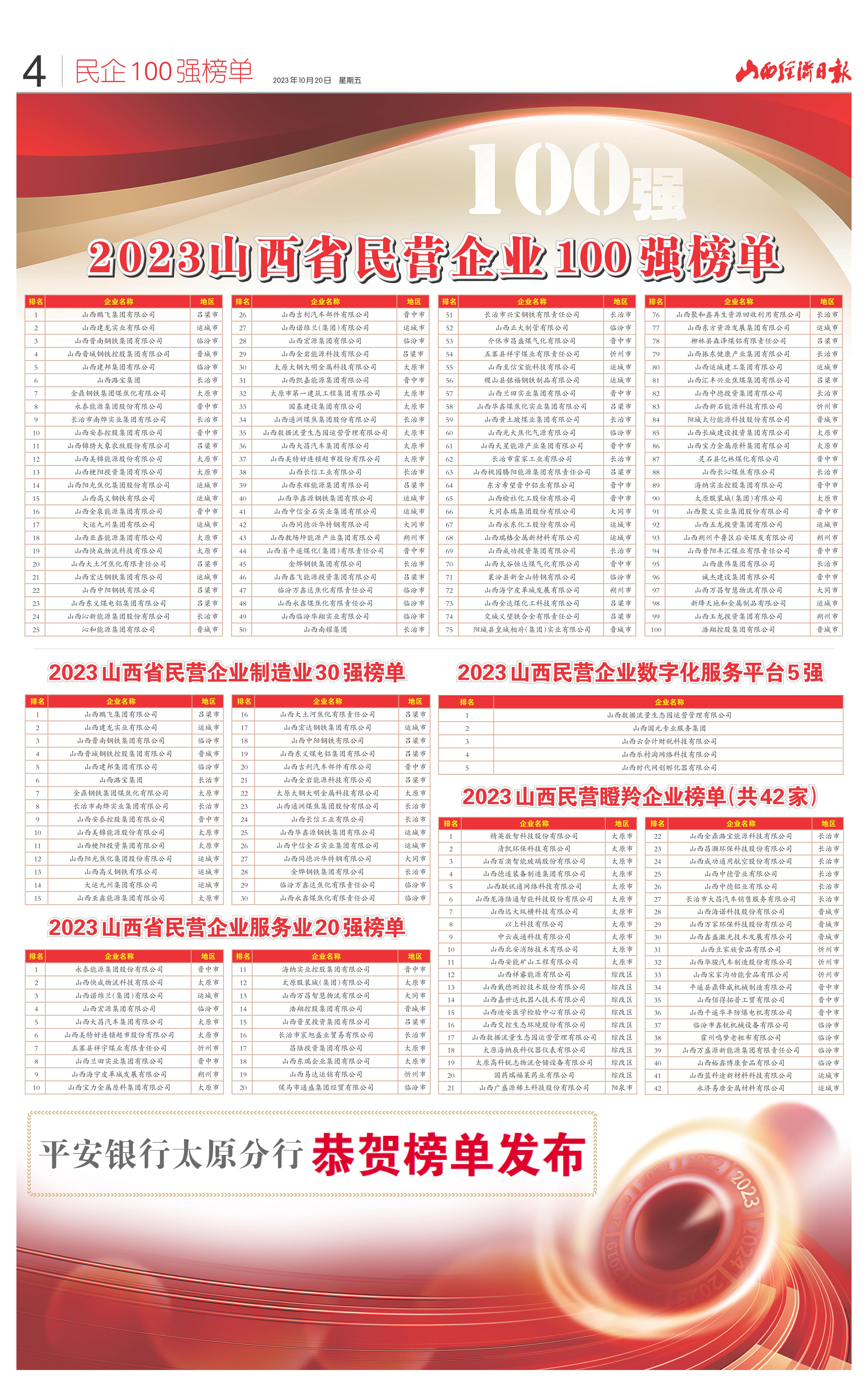 “百强民营企业作为山西民营经济的排头兵,集中展示着全省民营经济的综合实力、创新活力和市场竞争力。”省工商联相关负责人表示,要坚持以习近平新时代中国特色社会主义思想为指导,在省委、省政府的坚强领导下,不忘初心、牢记使命,同心奋斗,砥砺前行,以永不懈怠的拼搏精神和一往无前的奋斗姿态,为推进中国式现代化山西实践贡献更大力量。(记者李炼)