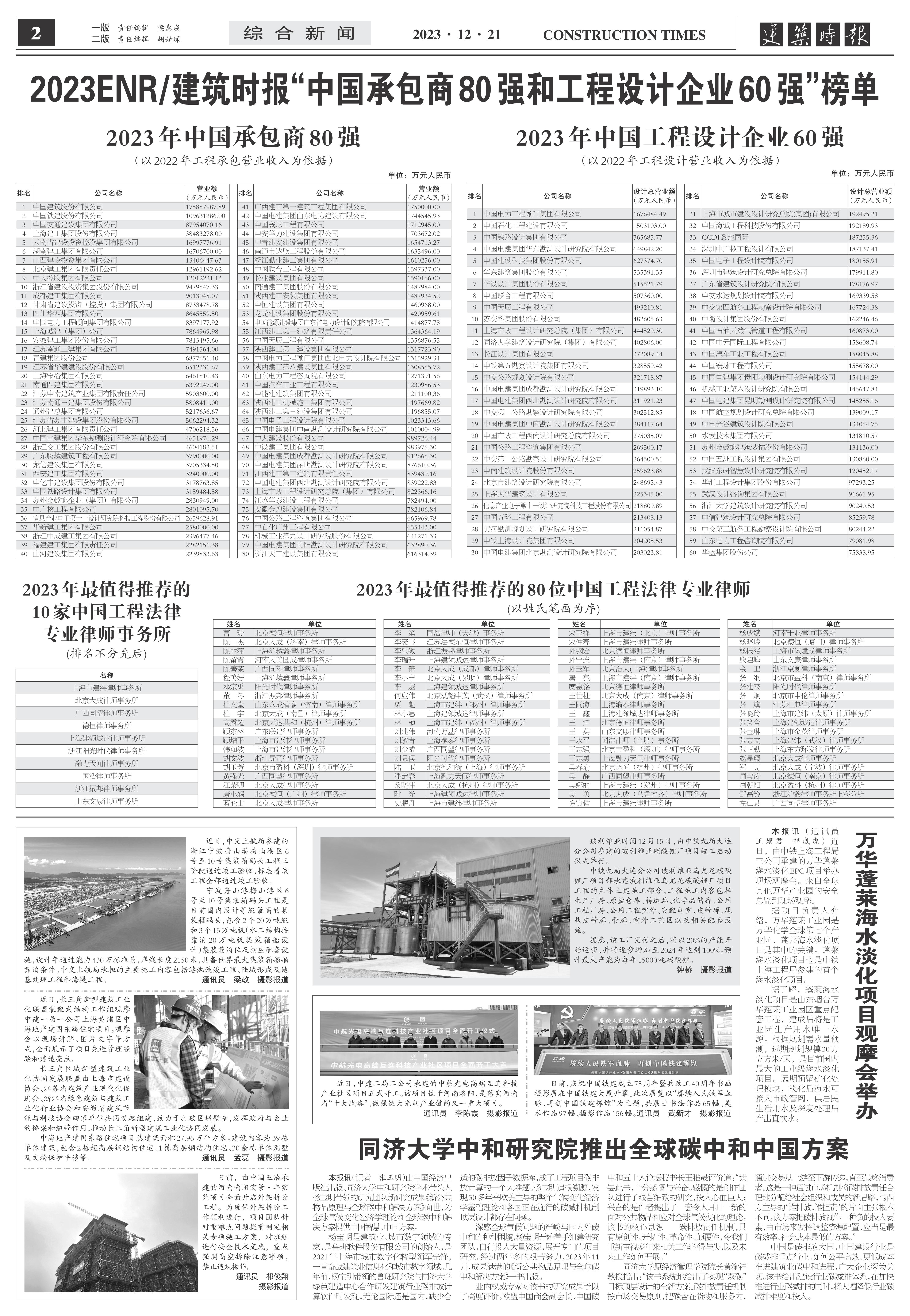 据悉,在发布两大总榜单的同时,《建筑时报》同期发布了2023最值得推荐的10家中国工程法律专业律师事务所和80位专业律师榜单。其中,上海市建纬律师事务所等10家中国工程法律专业律师事务所,北京德恒律师事务所曹珊等80位中国工程法律专业律师上榜。