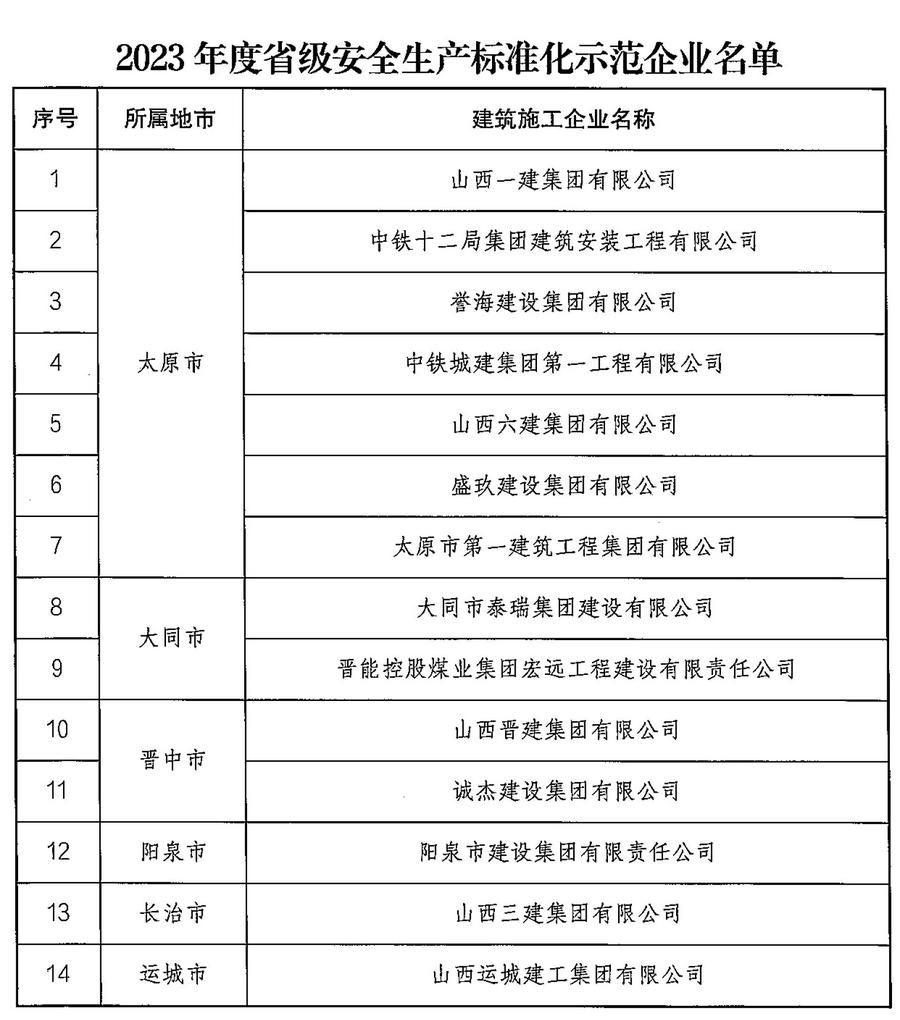 根据《山西省住房和城乡建设厅建筑施工安全生产标准化创建和考评实施细则》,经企业自主申报,省厅组织专家资料审查、现场核查,评定山西一建集团有限公司等14个企业为2023年度“省级安全生产标准化示范企业”,评定滨河东路南延二期工程施工一标段等38个项目为2023年度第二批“省级安全生产标准化示范项目”,且经公示无异议,现将名单予以公布。