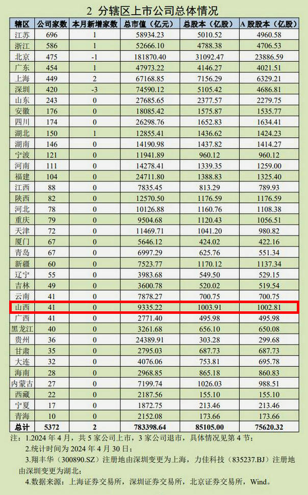 截至4月末,境内股票市场共有上市公司5372家,沪、深、北证券交易所分别为2272、2852、248家。分股份类型统计,仅发A股公司5139家,仅发B股公司11家,A+B、A+H等多股份类型的公司222家;分控股类型,国有控股和非国有控股公司数量分别占比26%、74%;按省域划分,广东、浙江、江苏上市公司家数分别为874、707、696家,汇集超40%上市公司。(记者姚均芳)
