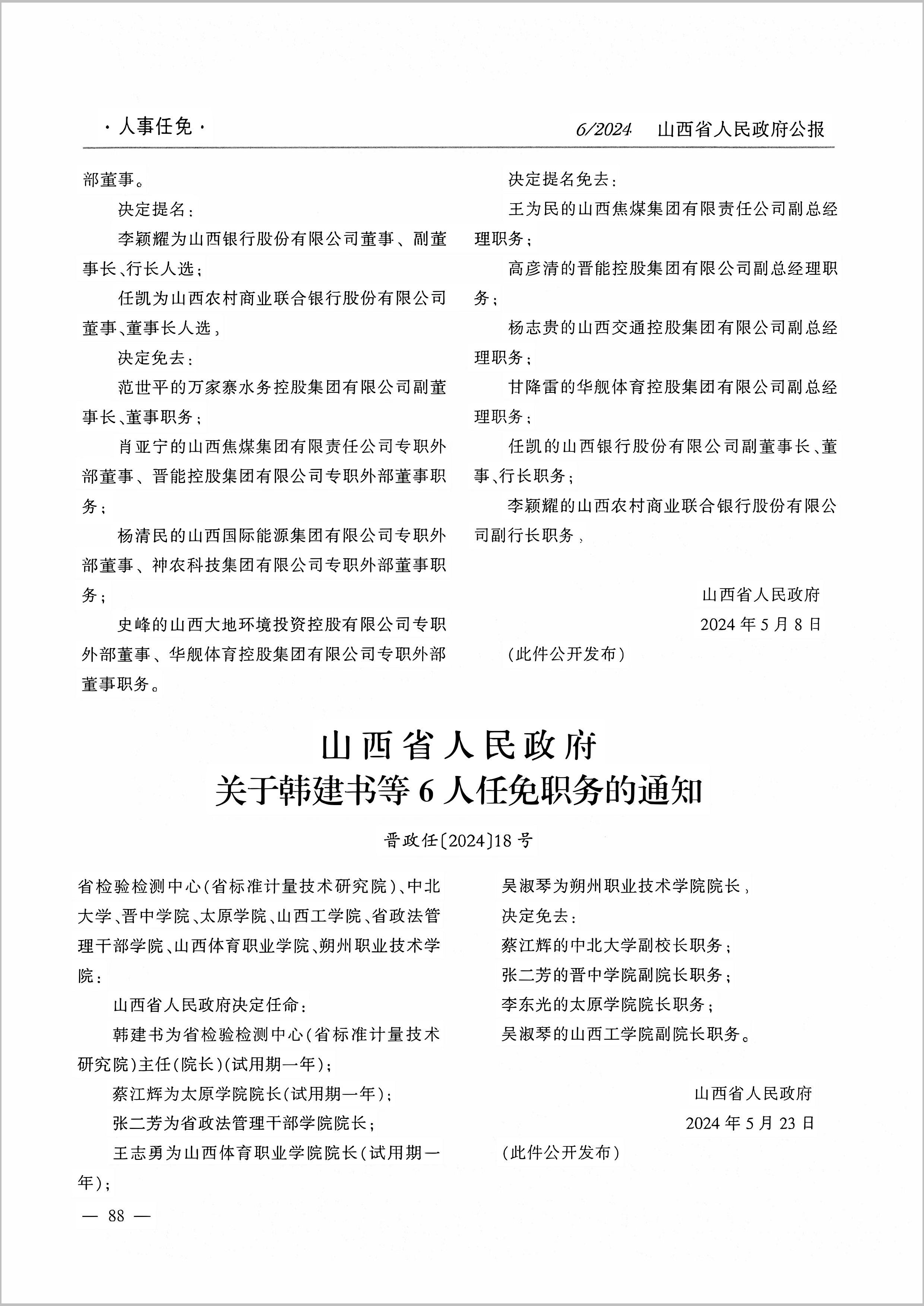 决定任命——韩建书为省检验检测中心(省标准计量技术研究院)主任(院长);蔡江辉为太原学院院长;张二芳为省政法管理干部学院院长;王志勇为山西体育职业学院院长;吴淑琴为朔州职业技术学院院长。