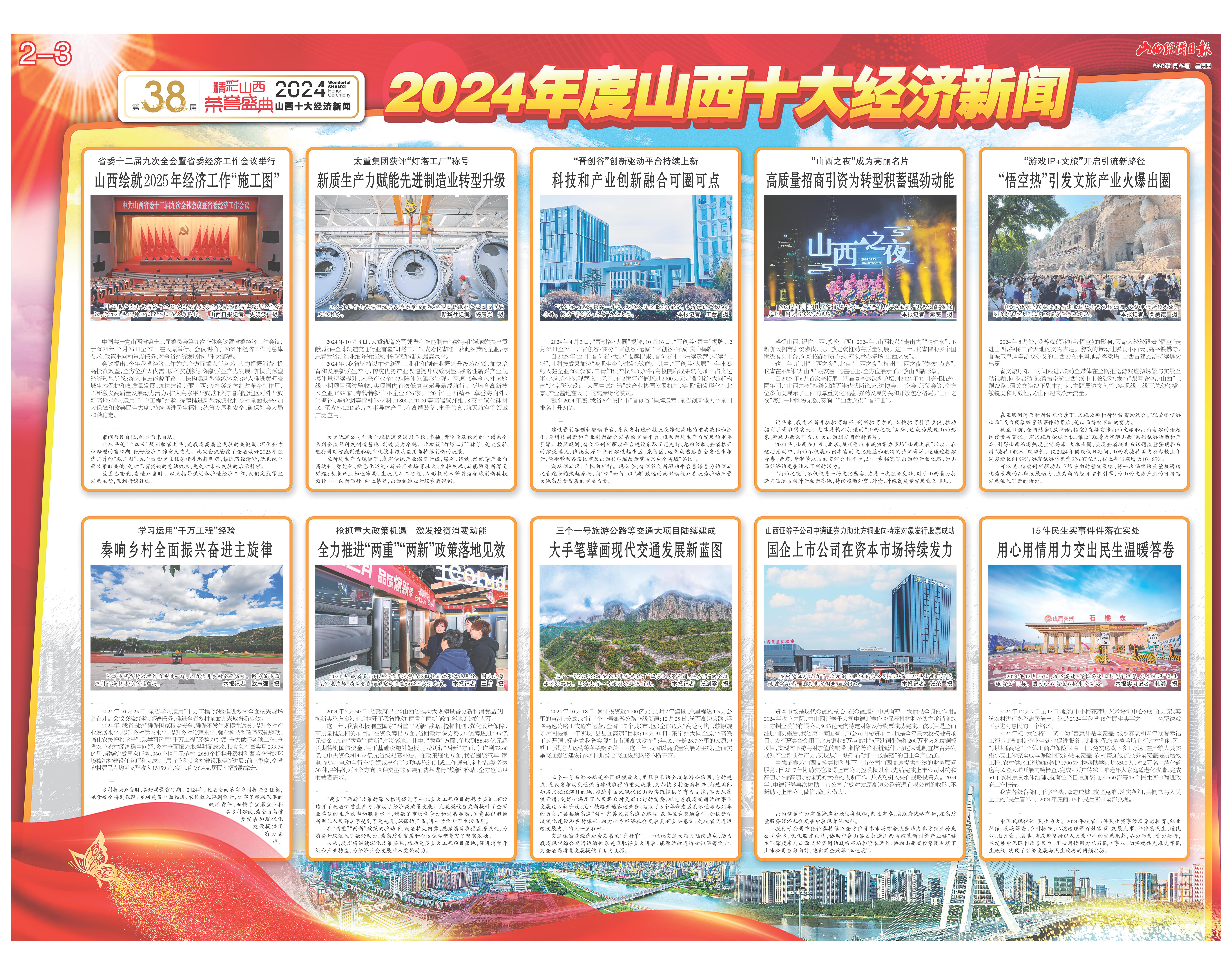 最终入选的2024年度山西十大经济新闻内容涉及工业、农业、交通、文旅、金融、民生等诸多领域,全面总结盘点了2024年度全省域经济大事要事,挖掘梳理出各行业领域亮点热点,以进一步激发全省上下推动高质量发展、深化全方位转型的强劲动能。这十条新闻分别是:省委十二届九次全会暨省委经济工作会议举行——山西绘就2025年经济工作“施工图”;太重集团获评“灯塔工厂”称号——新质生产力赋能先进制造业转型升级;“晋创谷”创新驱动平台持续上新——科技和产业创新融合可圈可点;“山西之夜”成为亮丽名片——高质量招商引资为转型积蓄强劲动能;“游戏IP+文旅”开启引流新路径——“悟空热”引发文旅产业火爆出圈;学习运用“千万工程”经验——奏响乡村全面振兴奋进主旋律;抢抓重大政策机遇、激发投资消费动能——全力推进“两重”“两新”政策落地见效;三个一号旅游公路等交通大项目陆续建成——大手笔擘画现代交通发展新蓝图;山西证券子公司中德证券力助北方铜业向特定对象发行股票成功——国企上市公司在资本市场持续发力;15件民生实事件件落在实处——用心用情用力交出民生温暖答卷。