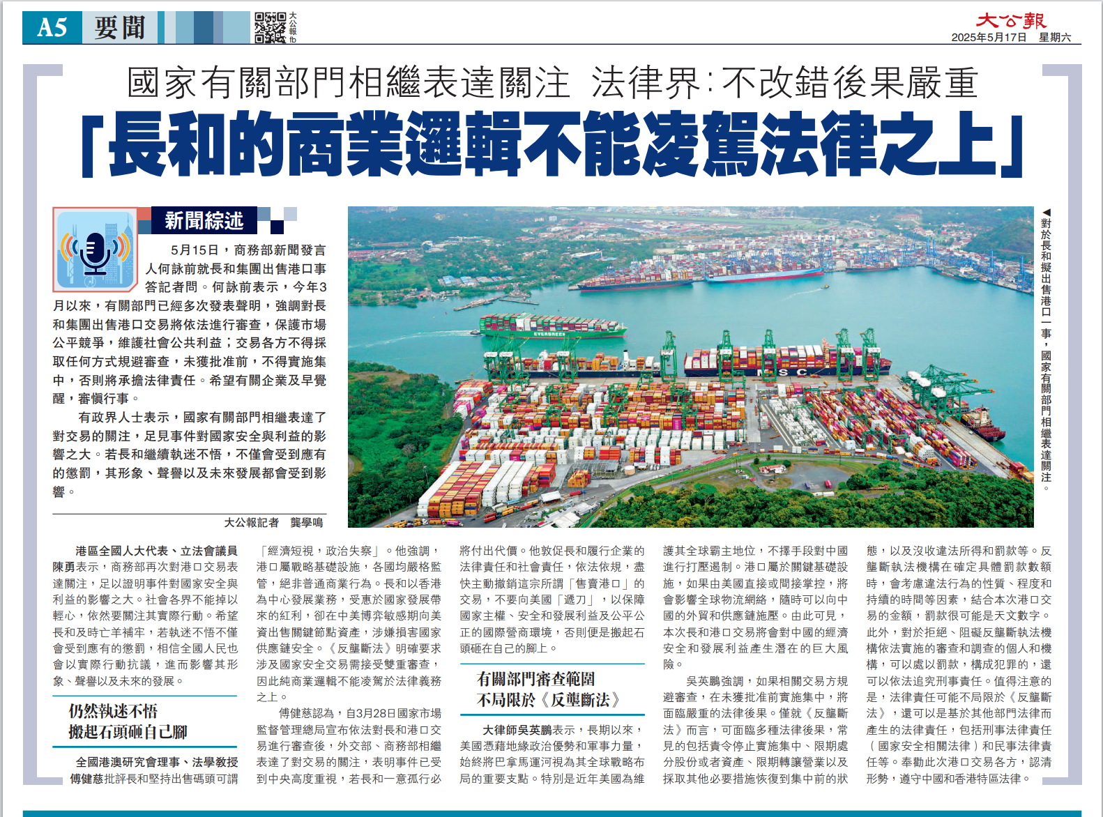 全国港澳研究会理事、法学教授傅健慈批评长和坚持出售码头可谓「经济短视,政治失察」。他强调,港口属战略基础设施,各国均严格监管,绝非普通商业行为。长和以香港为中心发展业务,受惠于国家发展带来的红利,却在中美博弈敏感期向美资出售关键节点资产,涉嫌损害国家供应链安全。 《反垄断法》明确要求涉及国家安全交易需接受双重审查,因此纯商业逻辑不能凌驾于法律义务之上。