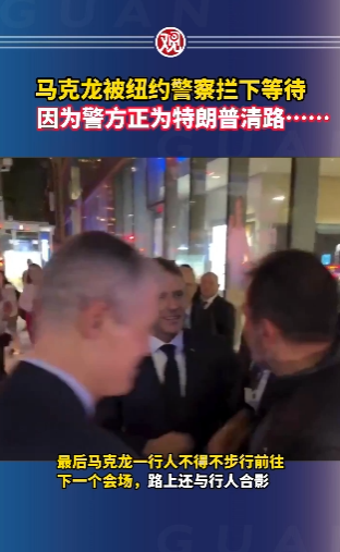 视频显示,马克龙乘坐的车辆被纽约警察拦了下来,马克龙随即下车询问情况。一名警察向马克龙道歉,他解释说,为了给特朗普的车队留出空间,道路已经被封锁。这名警察对马克龙说:“我很抱歉,总统先生,现在一切都被封锁了。”