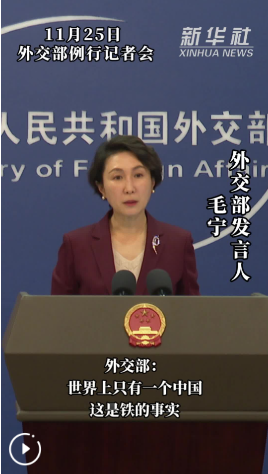 新华社北京11月25日电(记者刘杨、冯歆然)外交部发言人毛宁25日表示,世界上只有一个中国,台湾是中国领土不可分割的一部分,这是铁的事实,不容歪曲篡改。