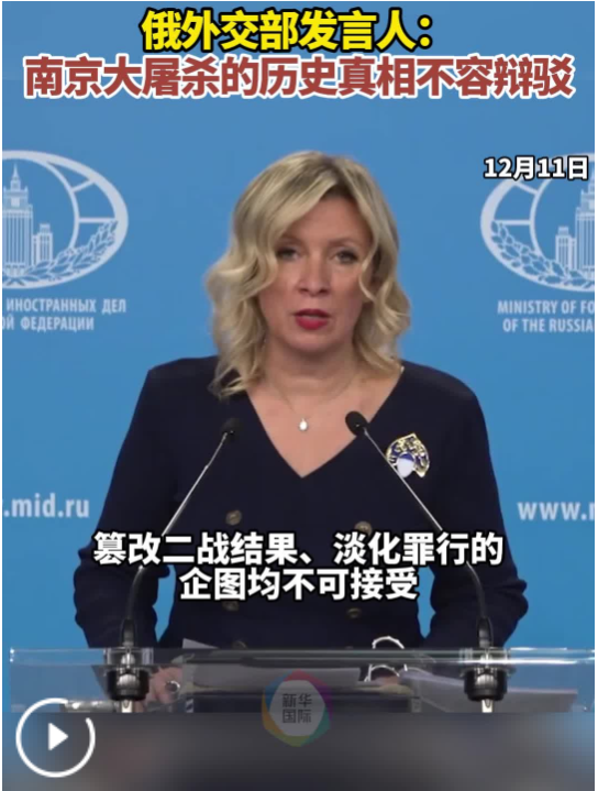 俄罗斯外交部发言人扎哈罗娃11日在例行记者会上说,南京大屠杀的历史真相不容辩驳