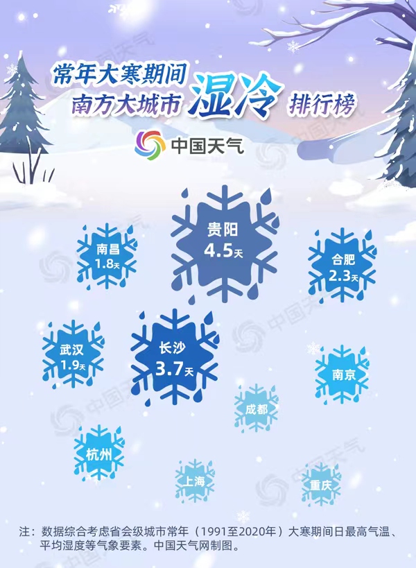 长沙、合肥、武汉、南昌也是大寒期间湿冷的代表城市。冬日里,不到5℃甚至0℃左右的气温,伴随着连日的雨雪,屋里屋外一样冷,都是这些城市在大寒期间常常遭遇的情景。此外,江南地区的南京、杭州、上海和西南地区的成都、重庆也都在湿冷排行榜上有名。