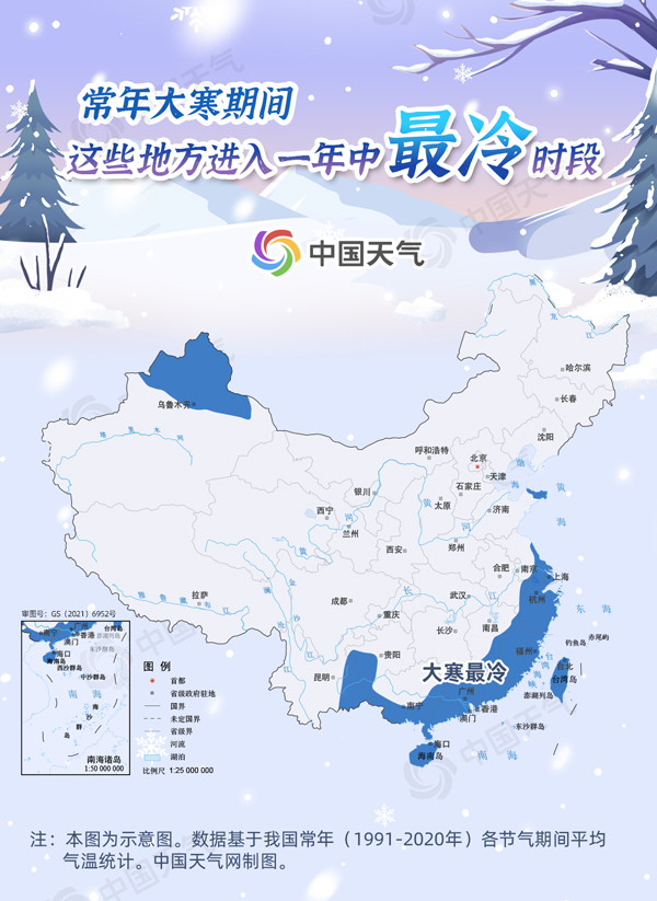 不过,从各区域平均气温来看,也有不少地方是在大寒节气达到全年最低,比如华东和华南沿海、新疆北部、山东半岛局地部分地区,总体而言,南方冷在大寒的区域相对更多一些。