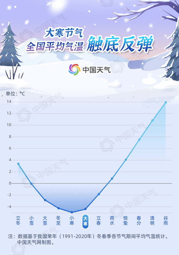 中国天气网盘点1991年至2020年节气大数据发现,在小寒期间,全国平均气温跌到全年最低,仅有-5.1℃。而到了大寒节气,气温开启反弹之旅,比小寒上升0.6℃,达到-4.5℃。从全国平均气温而言,我国在小寒节气达到最冷,大寒节气虽然依旧天寒地冻、万物蛰藏,但气温触底反弹、生机潜伏,春天的脚步越来越近了。
