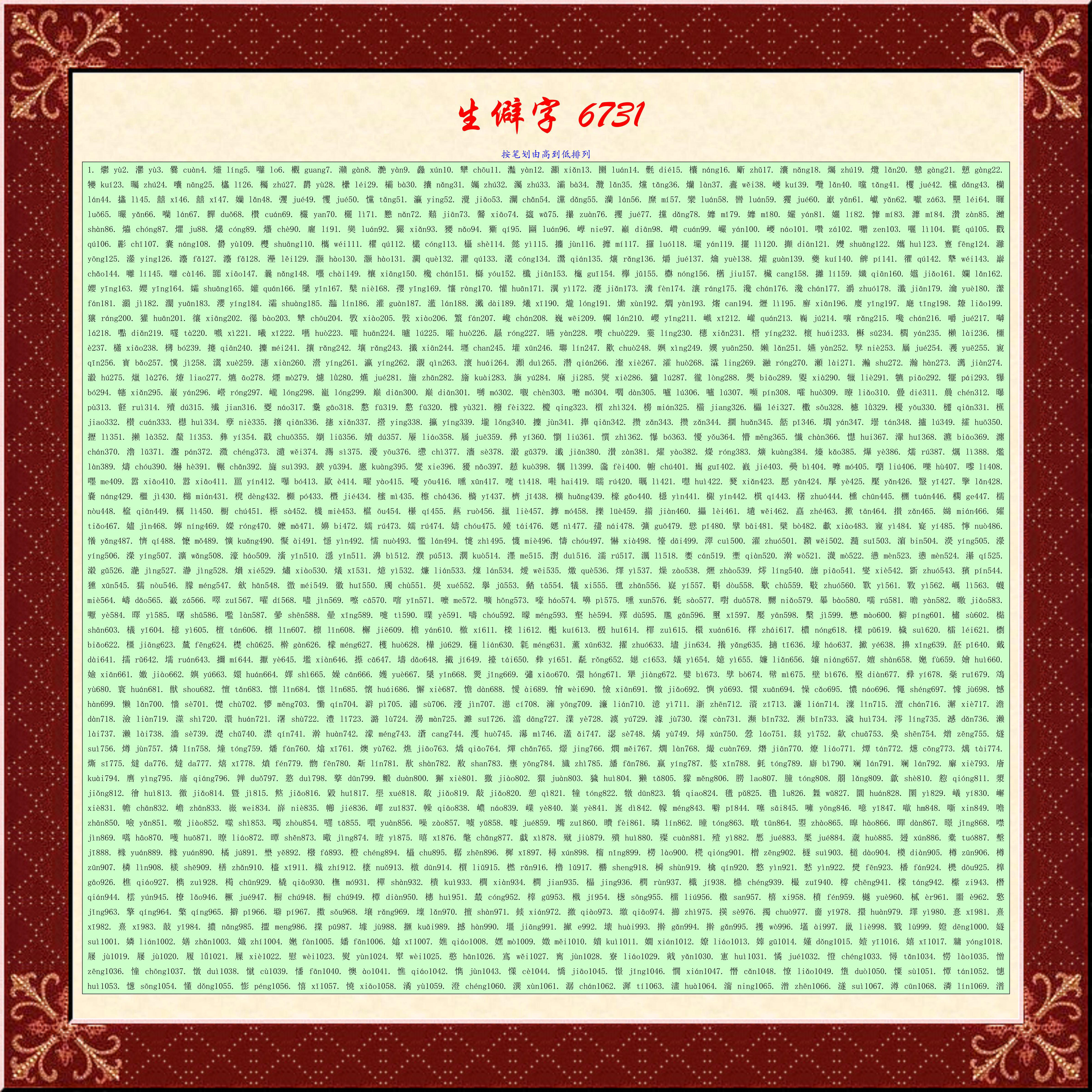 1. 爩 yù2. 灪 yù3. 爨 cuàn4. 爧 líng5. 囖 lo6. 欟 guang7. 灨 gàn8. 灧 yàn9. 灥 xún10. 犫 chōu11. 灎 yàn12. 灦 xiǎn13. 圞 luán14. 氎 dié15. 欜 náng16. 斸 zhǔ17. 灢 nǎng18. 爥 zhú19. 爦 lǎn20. 戆 gàng21. 戅 gàng22. 犪 kuí23. 曯 zhú24. 囔 nāng25. 欚 lǐ26. 欘 zhú27. 欝 yù28. 欙 léi29. 欛 bà30. 攮 nǎng31. 孎 zhú32. 灟 zhú33. 灞 bà34. 灠 lǎn35. 爣 tǎng36. 爤 làn37. 斖 wěi38. 巙 kuí39. 囕 lǎn40. 曭 tǎng41. 欔 jué42. 欓 dǎng43. 欗 lán44. 攭 lì45. 囍 xǐ46. 囍 xǐ47. 孏 lǎn48. 彏 jué49. 戄 jué50. 戃 tǎng51. 灜 ying52. 灚 jiǎo53. 灛 chǎn54. 灙 dǎng55. 灡 lán56. 爢 mí57. 灓 luán58. 曫 luán59. 玃 jué60. 巚 yǎn61. 巘 yǎn62. 囐 zá63. 壨 léi64. 曪 luǒ65. 曮 yǎn66. 囒 lán67. 奲 duǒ68. 欑 cuán69. 欕 yan70. 欐 lì71. 戁 nǎn72. 囏 jiān73. 毊 xiāo74. 攨 wā75. 攥 zuàn76. 攫 jué77. 攩 dǎng78. 孊 mǐ79. 孊 mǐ80. 孍 yán81. 孋 lí82. 戂 mí83. 灖 mǐ84. 灒 zàn85. 灗 shàn86. 爞 chóng87. 爠 ju88. 爜 cóng89. 爡 chè90. 廲 lí91. 奱 luán92. 玁 xiǎn93. 獿 nǎo94. 玂 qí95. 圝 luán96. 巕 nie97. 巓 diān98. 巑 cuán99. 巗 yán100. 巎 náo101. 囋 zá102. 囎 zen103. 囇 lì104. 氍 qú105. 戵 qú106. 彲 chī107. 囊 náng108. 欎 yù109. 欆 shuāng110. 欈 wéi111. 欋 qú112. 欉 cóng113. 欇 shè114. 懿 yì115. 攟 jùn116. 攠 mí117. 攞 luó118. 壧 yán119. 攦 lì120. 攧 diān121. 孇 shuāng122. 孈 huì123. 寷 fēng124. 灉 yōng125. 灐 ying126. 灋 fǎ127. 灋 fǎ128. 灅 lěi129. 灏 hào130. 灏 hào131. 灍 què132. 灈 qú133. 灇 cóng134. 灊 qián135. 爙 rǎng136. 爝 jué137. 爚 yuè138. 爟 guàn139. 夔 kuí140. 朇 pí141. 忂 qú142. 犩 wéi143. 巐 chǎo144. 囄 lí145. 囃 cà146. 嚻 xiāo147. 曩 nǎng148. 囆 chài149. 欀 xiāng150. 欃 chán151. 櫾 yóu152. 櫼 jiān153. 櫷 guī154. 欅 jǔ155. 欁 nóng156. 欍 jiu157. 欌 cang158. 攡 lí159. 孅 qiān160. 孂 jiǎo161. 孄 lǎn162. 孆 yīng163. 孆 yīng164. 孀 shuāng165. 孉 quán166. 櫽 yǐn167. 櫱 niè168. 孾 yīng169. 懹 ràng170. 懽 huān171. 瀷 yì172. 瀽 jiǎn173. 瀵 fèn174. 瀼 ráng175. 瀺 chán176. 瀺 chán177. 灂 zhuó178. 瀸 jiān179. 瀹 yuè180. 瀿 fán181. 瀱 jì182. 灁 yuān183. 瀴 yíng184. 灀 shuàng185. 瀶 lín186. 灌 guàn187. 灆 lán188. 瀻 dài189. 爔 xī190. 爖 lóng191. 爋 xùn192. 爓 yàn193. 爘 can194. 爏 lì195. 廯 xiān196. 廮 yǐng197. 廰 tīng198. 爒 liǎo199. 獽 ráng200. 獾 huān201. 忀 xiāng202. 忁 bào203. 犨 chōu204. 斆 xiào205. 斅 xiào206. 瀪 fán207. 巉 chán208. 巍 wēi209. 幱 lán210. 巊 yǐng211. 巇 xī212. 巏 quán213. 巈 jú214. 嚷 rǎng215. 嚵 chán216. 嚼 jué217. 嚹 lá218. 嚸 diǎn219. 嚺 tà220. 嚱 xì221. 曦 xī222. 嚿 huò223. 嚾 huān224. 曥 lú225. 曤 huò226. 曧 róng227. 曣 yàn228. 嚽 chuò229. 孁 líng230. 櫶 xiǎn231. 櫿 yíng232. 櫰 huái233. 櫯 sū234. 櫩 yán235. 櫴 lài236. 櫮 è237. 櫹 xiāo238. 欂 bó239. 攓 qiān240. 攗 méi241. 攘 rǎng242. 壤 rǎng243. 攕 xiān244. 壥 chan245. 壦 xūn246. 壣 lín247. 歠 chuò248. 嬹 xìng249. 嬽 yuān250. 嬾 lǎn251. 嬿 yàn252. 孼 niè253. 屫 jué254. 彟 yuē255. 寴 qīn256. 寳 bǎo257. 懻 jì258. 瀥 xuè259. 瀗 xiàn260. 瀯 yíng261. 瀛 yíng262. 瀙 qìn263. 瀤 huái264. 瀩 duì265. 濳 qián266. 瀣 xiè267. 瀖 huò268. 瀮 ling269. 瀜 róng270. 瀬 lài271. 瀭 shu272. 瀚 hàn273. 瀳 jiàn274. 瀫 hú275. 爉 là276. 爎 liao277. 爊 āo278. 爅 mò279. 爈 lǜ280. 爑 jué281. 旜 zhān282. 旝 kuài283. 旟 yú284. 廭 ji285. 爕 xiè286. 獹 lú287. 徿 lòng288. 爂 biāo289. 夓 xià290. 犣 liè291. 犥 piāo292. 犤 pái293. 犦 bó294. 幰 xiǎn295. 巌 yán296. 巆 róng297. 巄 lóng298. 巃 lóng299. 巅 diān300. 巅 diān301. 嚩 mó302. 嚫 chèn303. 嚰 mó304. 嚪 dàn305. 嚧 lú306. 嚧 lú307. 嚬 pín308. 嚯 huò309. 曢 liǎo310. 曡 dié311. 曟 chén312. 曝 pù313. 壡 ruì314. 殰 dú315. 殱 jian316. 夒 náo317. 櫜 gāo318. 懯 fū319. 懯 fū320. 櫲 yù321. 櫠 fèi322. 櫦 qing323. 櫍 zhì324. 櫋 mián325. 櫤 jiang326. 櫑 léi327. 櫢 sǒu328. 櫖 lǜ329. 櫌 yōu330. 櫏 qiān331. 櫵 jiao332. 櫕 cuán333. 櫘 huì334. 孽 niè335. 攐 qiān336. 攇 xiǎn337. 攚 ying338. 攍 yíng339. 壠 lǒng340. 攈 jùn341. 攑 qiān342. 攒 zǎn343. 攒 zǎn344. 攌 huǎn345. 嚭 pǐ346. 壛 yán347. 壜 tán348. 攎 lú349. 攉 huō350. 攊 lì351. 攋 là352. 斄 lí353. 彝 yí354. 戳 chuō355. 嬼 liǔ356. 嬻 dú357. 屪 liáo358. 屩 juē359. 彞 yí360. 懰 liú361. 懫 zhì362. 懪 bó363. 懮 yǒu364. 懵 měng365. 懴 chàn366. 懳 hui367. 瀈 huī368. 瀌 biāo369. 瀍 chán370. 瀂 lǔ371. 瀊 pán372. 瀓 chéng373. 瀢 wěi374. 瀃 sì375. 瀀 yōu376. 懘 chì377. 瀒 sè378. 瀔 gǔ379. 瀐 jiān380. 濽 zàn381. 燿 yào382. 爃 róng383. 爌 kuàng384. 燺 kǎo385. 爗 yè386. 燸 rú387. 爄 lì388. 爁 làn389. 燽 chóu390. 爀 hè391. 冁 chǎn392. 旞 suì393. 斔 yǔ394. 懬 kuàng395. 夑 xie396. 獶 nǎo397. 懖 kuò398. 犡 lì399. 濷 fèi400. 幮 chú401. 巂 guī402. 巀 jié403. 奰 bì404. 嚤 mó405. 嚠 liú406. 嚛 hù407. 嚟 lí408. 嚜 me409. 嚣 xiāo410. 嚣 xiāo411. 嚚 yín412. 嚗 bó413. 歞 è414. 曜 yào415. 嚘 yōu416. 曛 xūn417. 嚔 tì418. 嚡 hai419. 曘 rú420. 曞 lì421. 嚖 huì422. 燹 xiǎn423. 懕 yān424. 擪 yè425. 檿 yǎn426. 毉 yī427. 擥 lǎn428. 嚢 náng429. 檵 jì430. 檰 mián431. 櫈 dèng432. 櫇 pó433. 櫭 jié434. 櫁 mì435. 檫 chá436. 檹 yī437. 櫅 jī438. 櫎 huǎng439. 檺 gǎo440. 檼 yìn441. 檭 yín442. 檱 qí443. 櫡 zhuó444. 櫄 chūn445. 檲 tuán446. 櫊 ge447. 檽 nòu448. 檶 qiān449. 櫔 lì450. 櫉 chú451. 櫒 sà452. 櫗 miè453. 櫙 ōu454. 櫀 qí455. 爇 ruò456. 擸 liè457. 擵 mó458. 擽 lüè459. 擶 jiàn460. 攂 lèi461. 壝 wěi462. 嚞 zhé463. 擹 tān464. 攅 zǎn465. 嬵 mián466. 嬥 tiǎo467. 