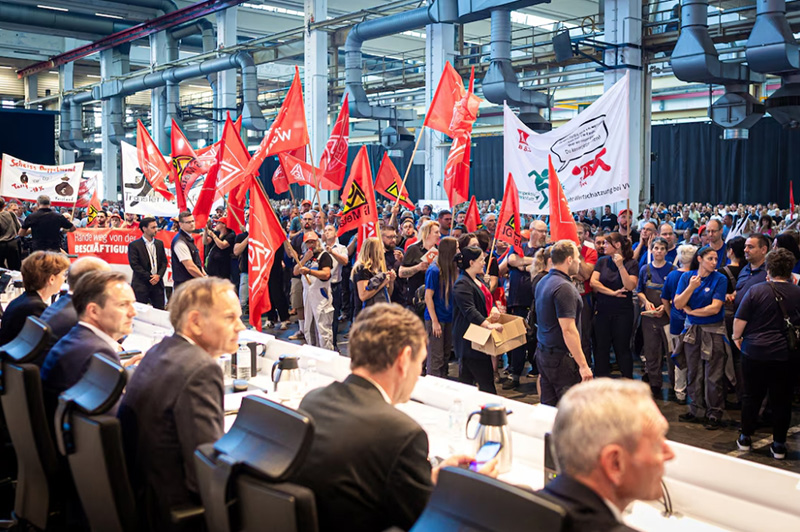 当地时间9月4日,首次传出将关闭本土工厂消息后,大众汽车在总部举行员工大会,工人们手举标语抗议。 路透社