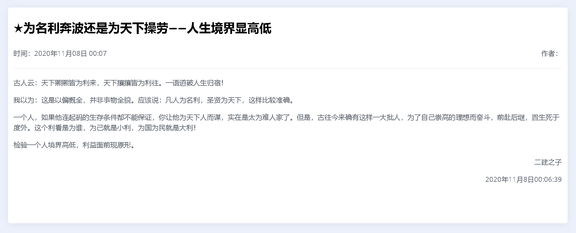 一个人,如果他连起码的生存条件都不能保证,你让他为天下人而谋,实在是太为难人家了。但是,古往今来确有这样一大批人,为了自己崇高的理想而奋斗,前赴后继,置生死于度外。这个利看是为谁,为己就是小利,为国为民就是大利!