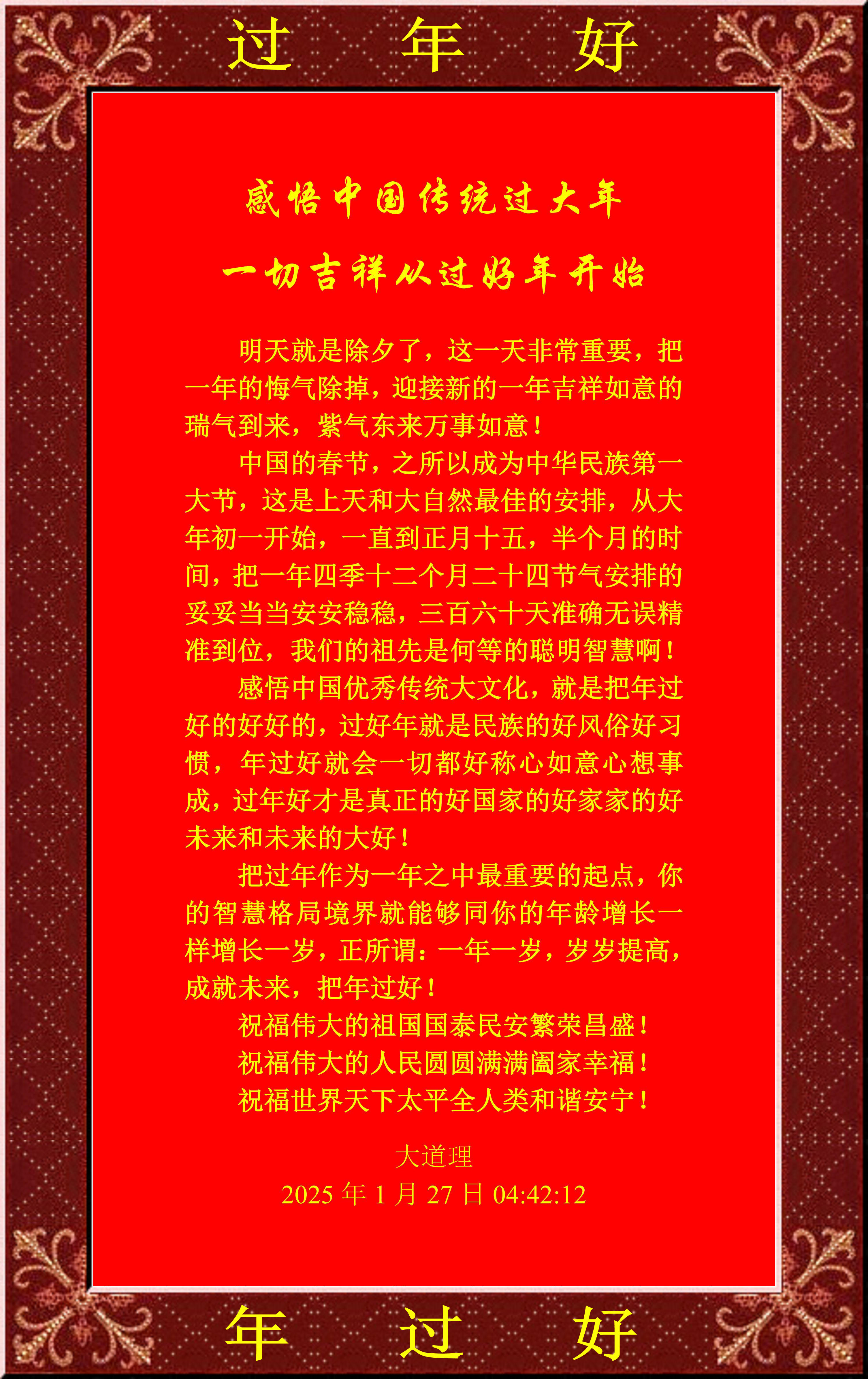 感悟中国优秀传统大文化,就是把年过好的好好的,过好年就是民族的好风俗好习惯,年过好就会一切都好称心如意心想事成,过年好才是真正的好国家的好家家的好未来和未来的大好!