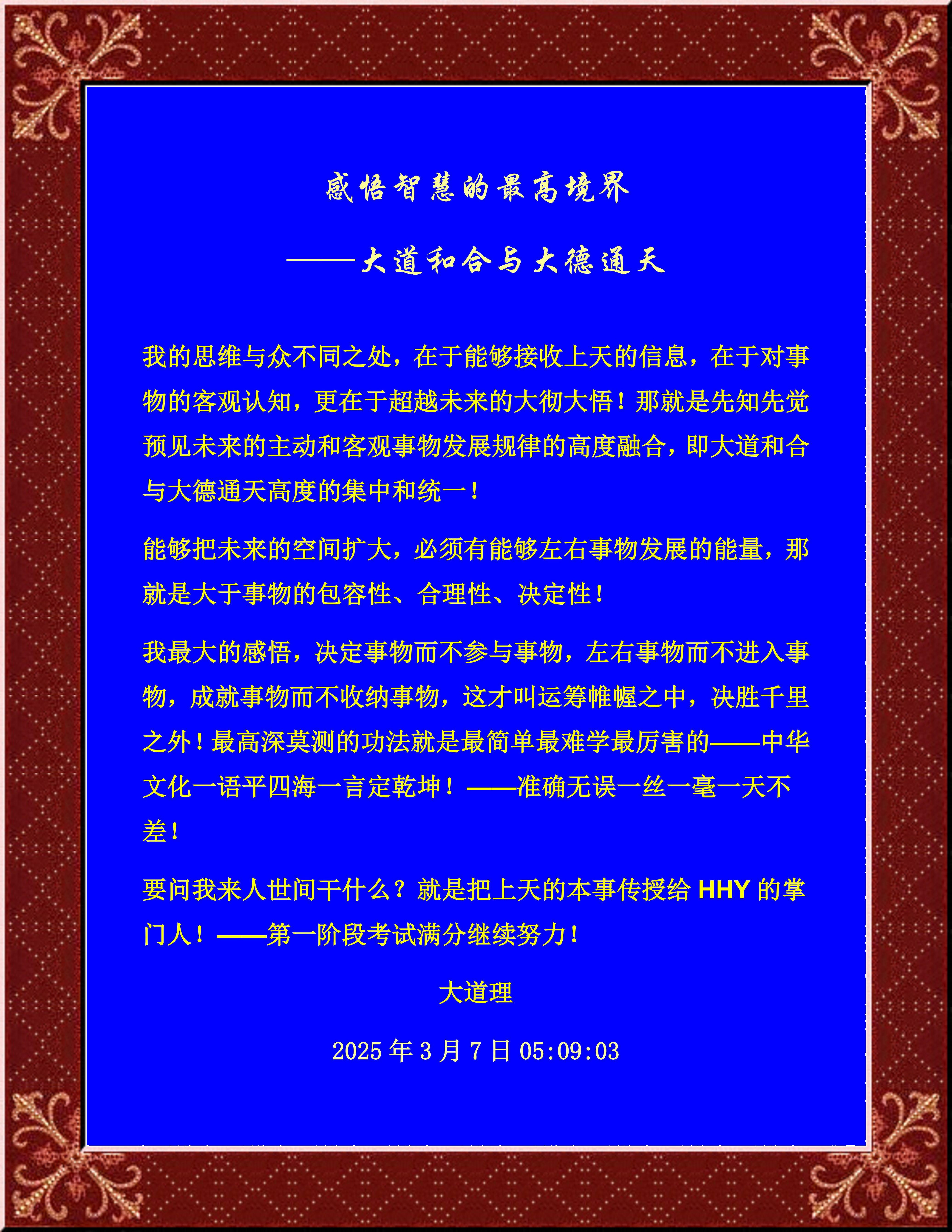 我的思维与众不同之处,在于能够接收上天的信息,在于对事物的客观认知,更在于超越未来的大彻大悟!那就是先知先觉预见未来的主动和客观事物发展规律的高度融合,即大道和合与大德通天高度的集中和统一!