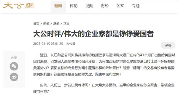3月15日,香港《大公报》发布题为“伟大的企业家都是铮铮爱国者”的时评,就李嘉诚旗下香港长江和记实业有限公司拟将包括巴拿马运河两大港口在内的43个港口出售给美国财团的消息提出5个问题。
