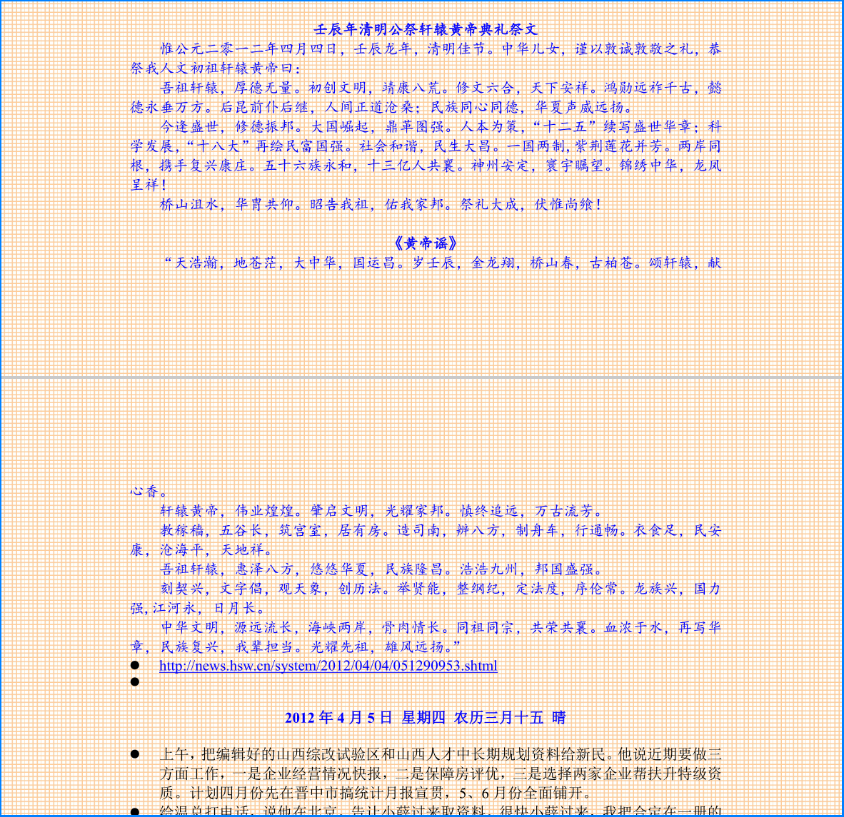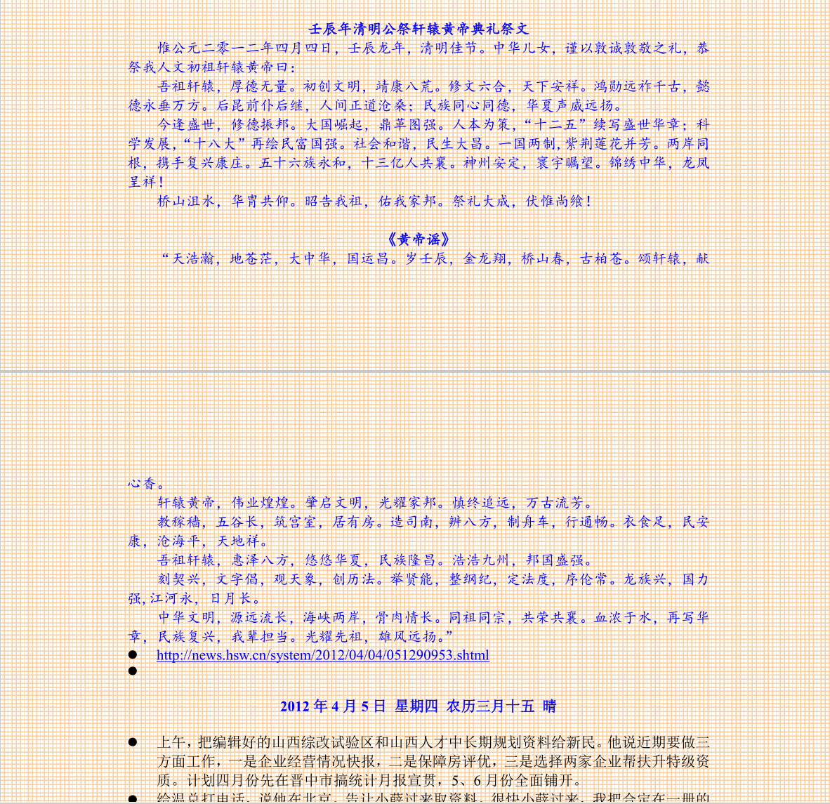 惟公元二零一二年四月四日,壬辰龙年,清明佳节。中华儿女,谨以敦诚敦敬之礼,恭祭我人文初祖轩辕黄帝曰: